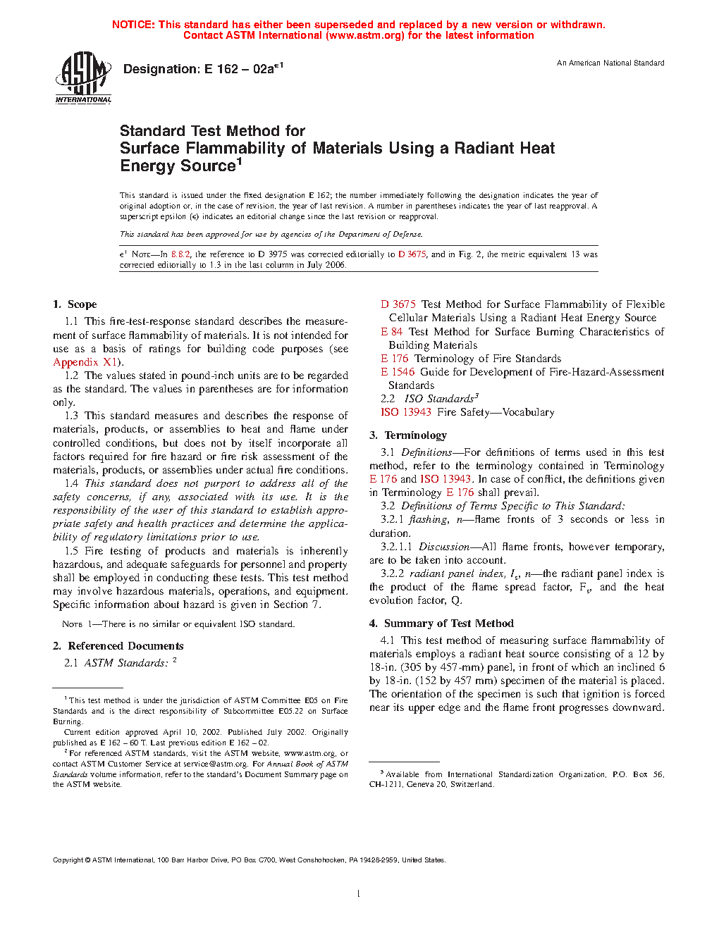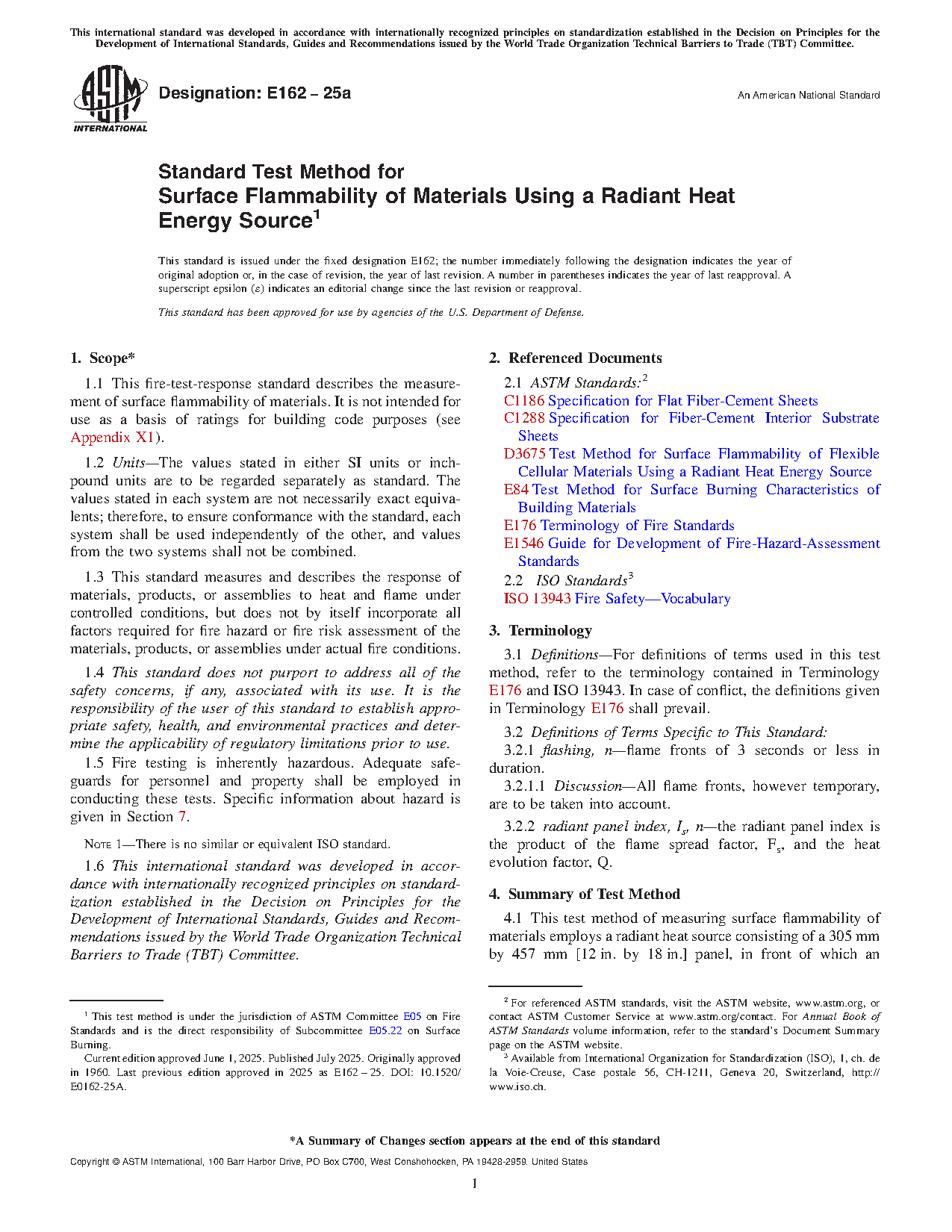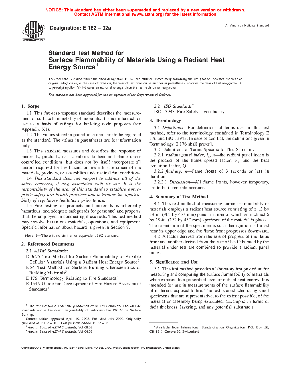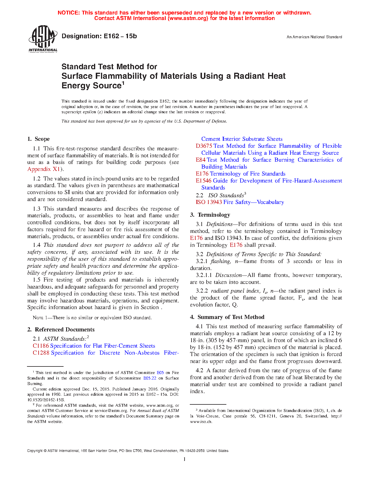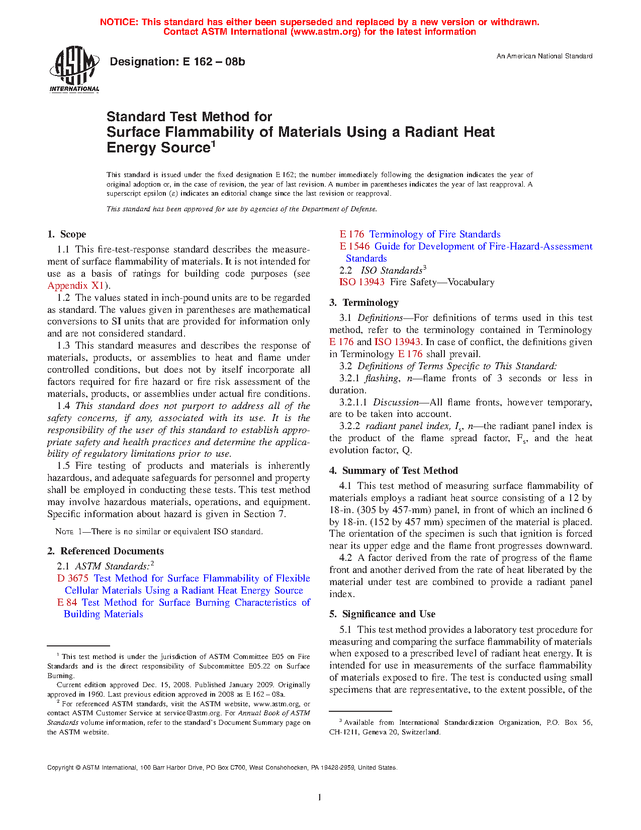 1.1 This fire-test-response standard describes the measurement of surface flammability of materials. It is not intended for use as a basis of ratings for building code purposes (see Appendix X1).