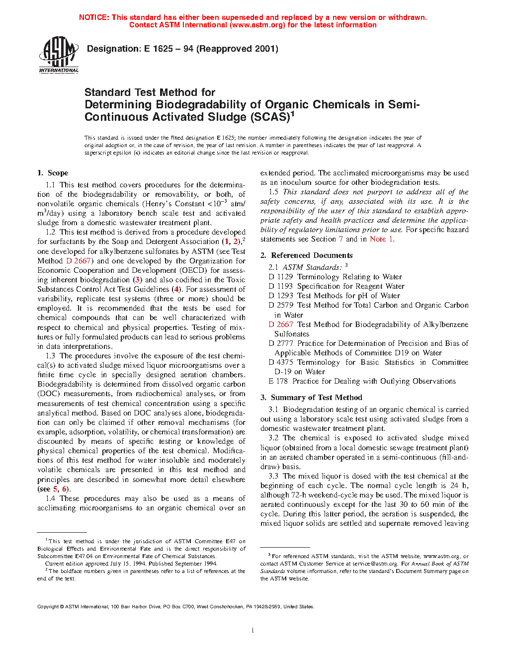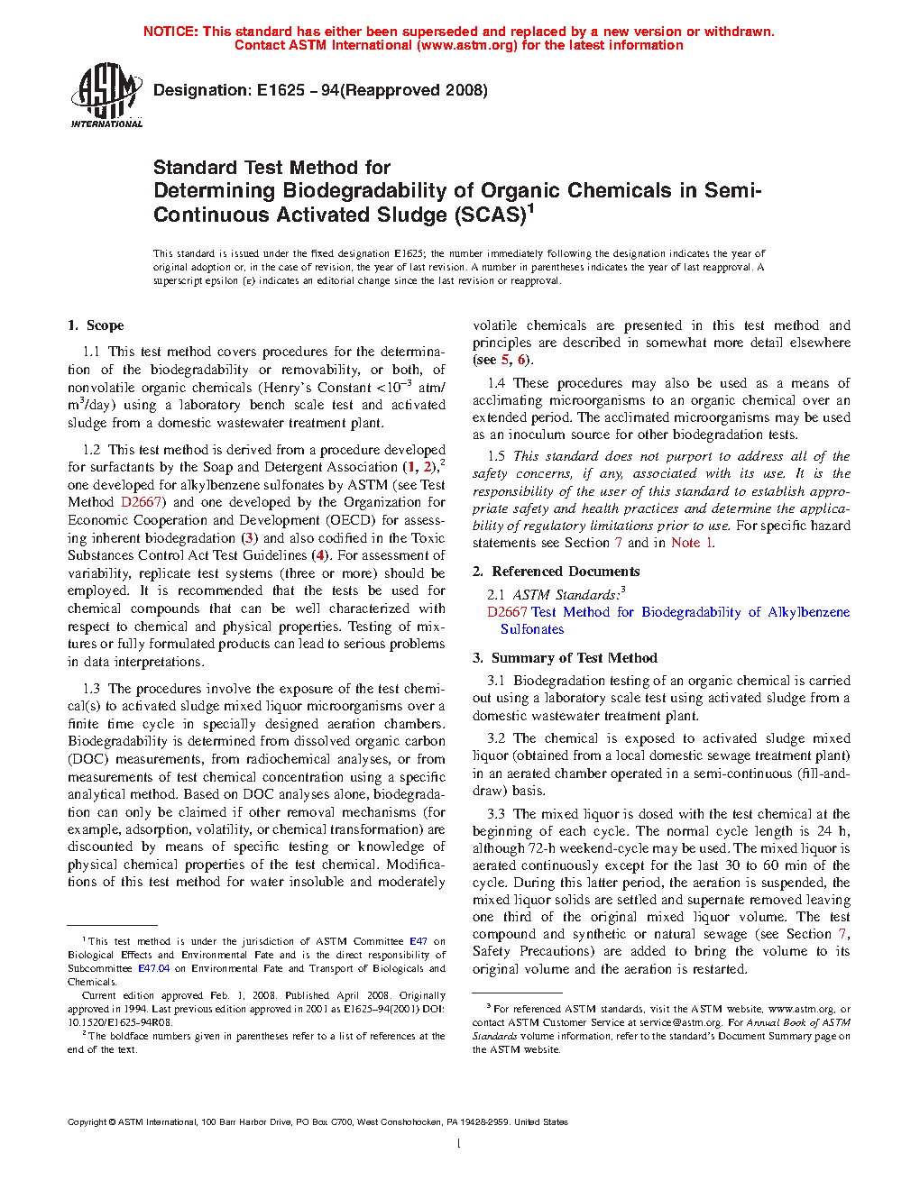 1.1 This test method covers procedures for the determination of the biodegradability or removability, or both, of nonvolatile organic chemicals (Henry's Constant <10 -3 atm/m3 /day) using a laboratory bench scale test and activated sludge from a domestic wastewater treatment plant.