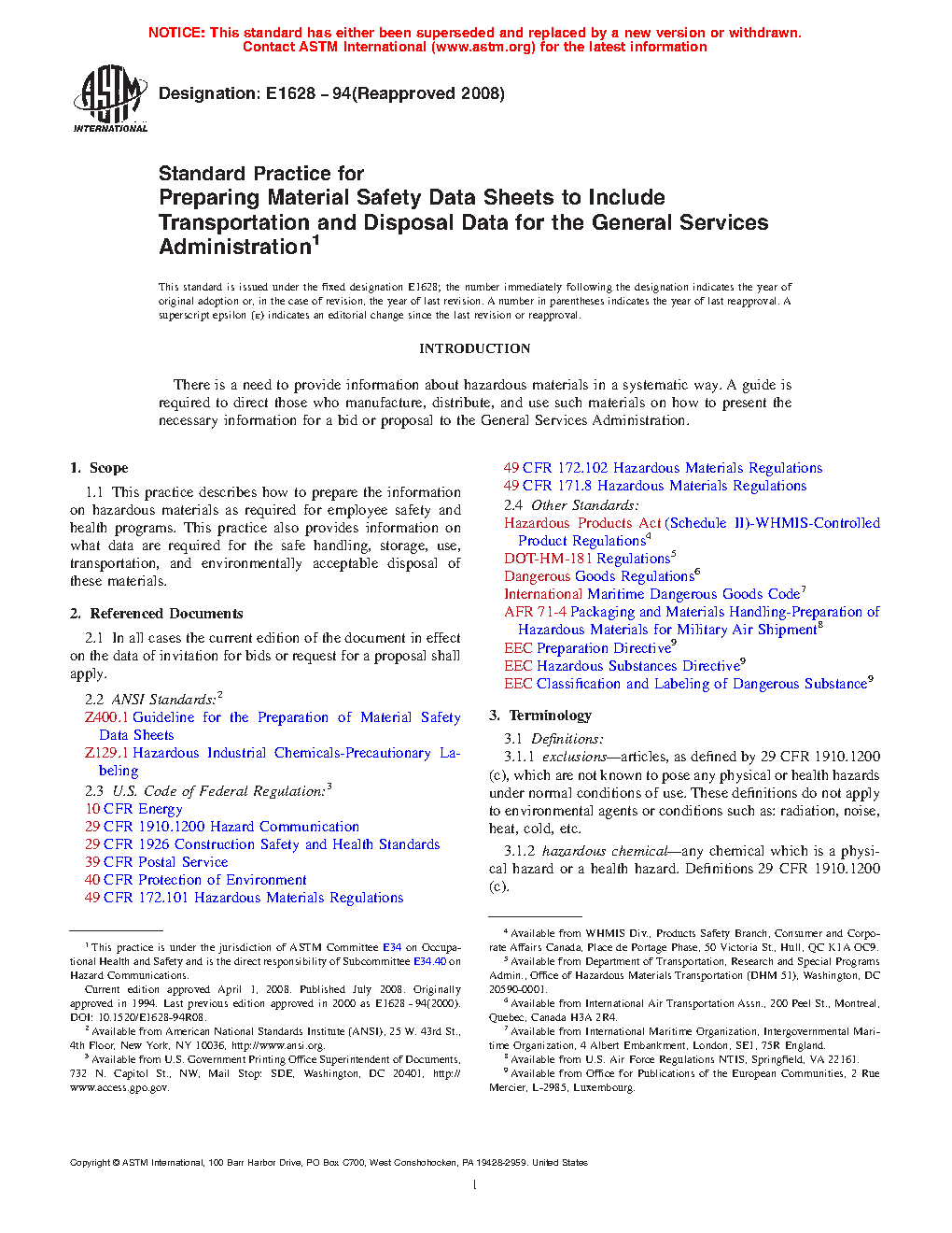 This practice was developed at the request of the General Services Administration of the United States government. It is intended to provide guidance and assistance to anyone charged with the responsibility of creating or reviewing material safety data sheets (MSDS) for accuracy. Such sheets are required of any vendor who provides goods or services which may be hazardous in any way. This guide is not a legal document and does not purport to officially represent the requirements of the Occupational Safety and Health Administration Hazard Communication Standard, requirements of EPA (Environmental Protection Agency’Emergency Planning and Community Right-To-Know Act), the laws of any state or municipality, or the laws of any foreign nation.