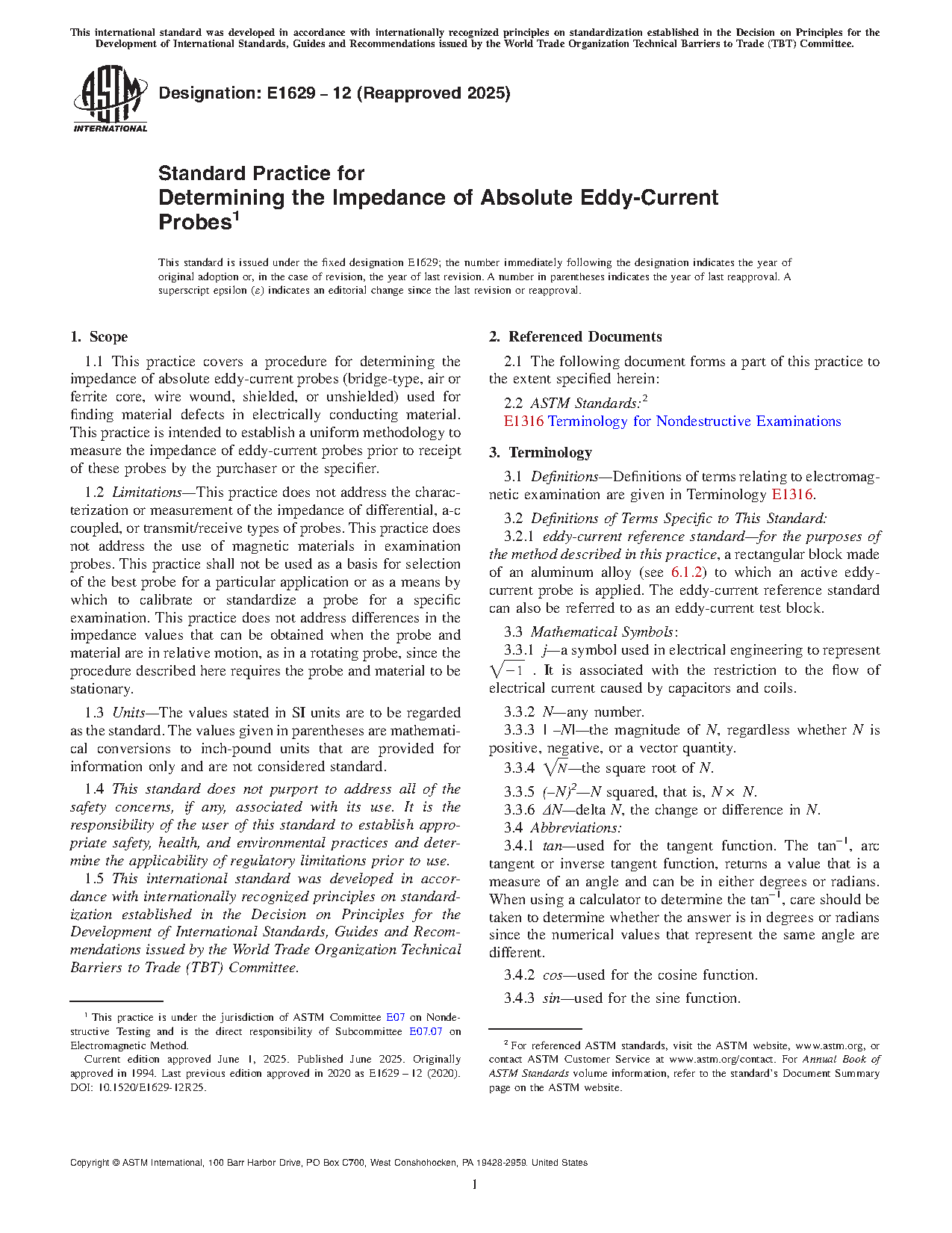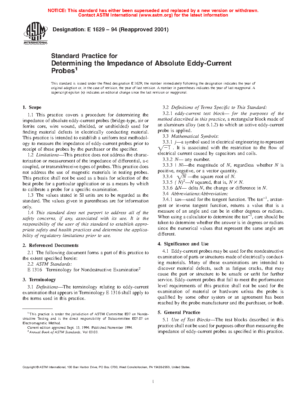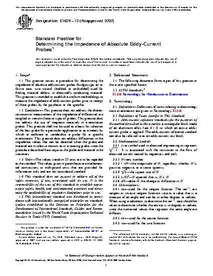 1.1 This practice covers a procedure for determining the impedance of absolute eddy-current probes (bridge-type, air or ferrite core, wire wound, shielded, or unshielded) used for finding material defects in electrically conducting material. This practice is intended to establish a uniform methodology to measure the impedance of eddy-current probes prior to receipt of these probes by the purchaser or the specifier.