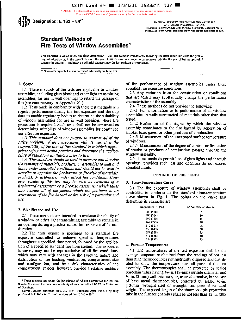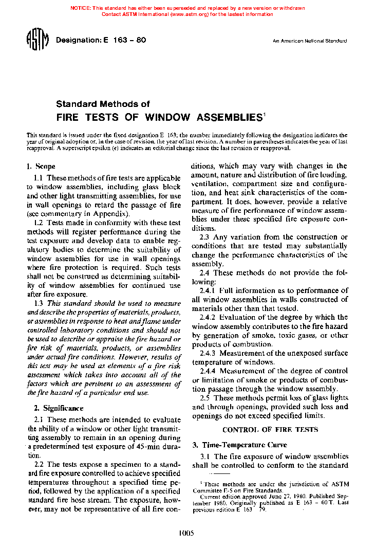 Methods for Fire Tests of Window Assemblies (Withdrawn 1995)