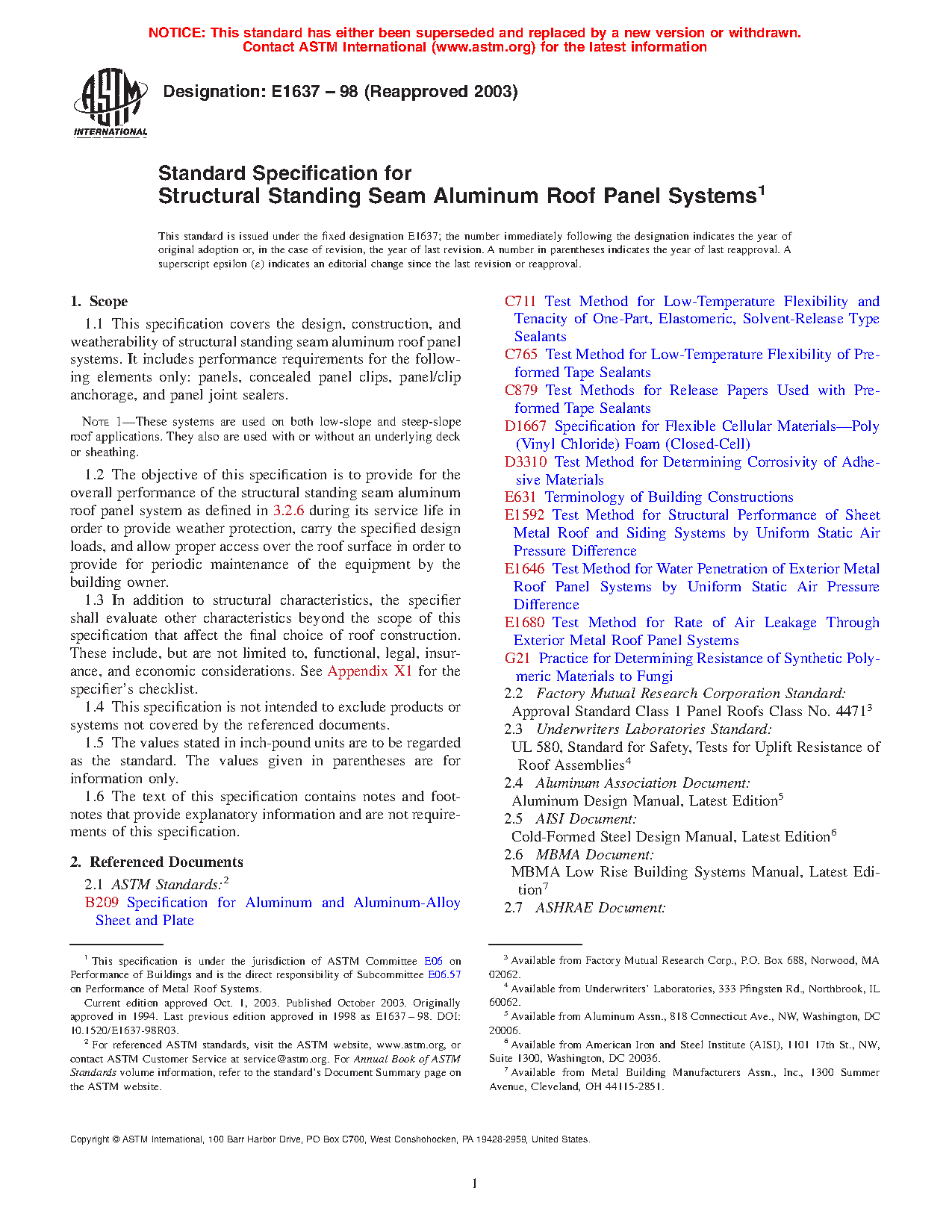 1.2 The objective of this specification is to provide for the overall performance of the structural standing seam aluminum roof panel system as defined in 3.2.6 during its service life in order to provide weather protection, carry the specified design loads, and allow proper access over the roof surface in order to provide for periodic maintenance of the equipment by the building owner.