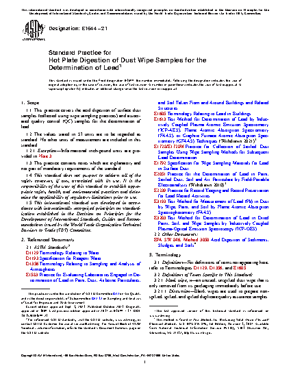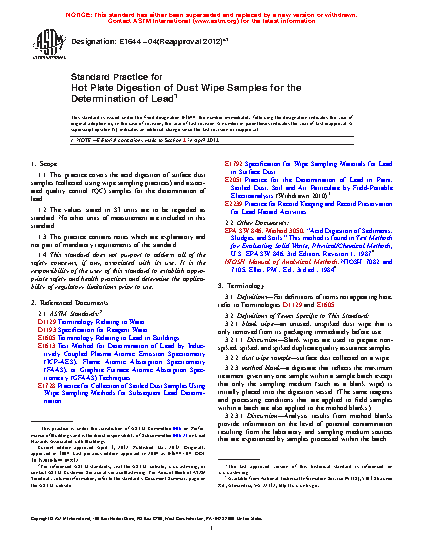 1.1 This practice covers the acid digestion of surface dust samples (collected using wipe sampling practices) and associated quality control (QC) samples for the determination of lead.