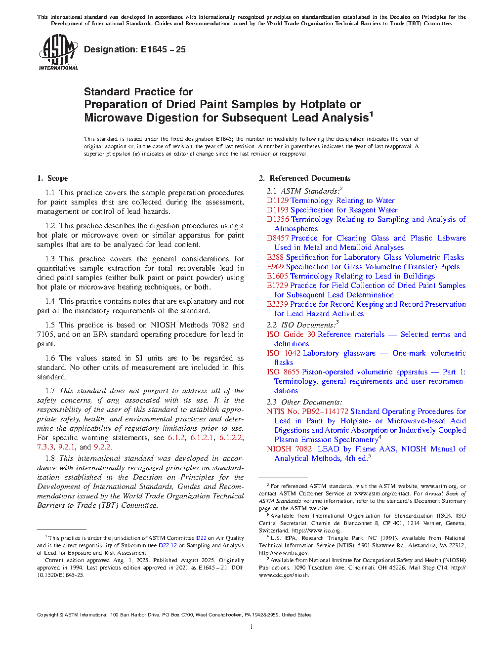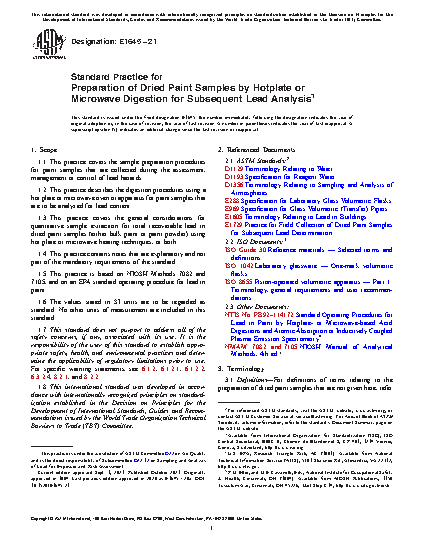 1.1 This practice covers the sample preparation procedures for paint samples that are collected during the assessment, management or control of lead hazards.