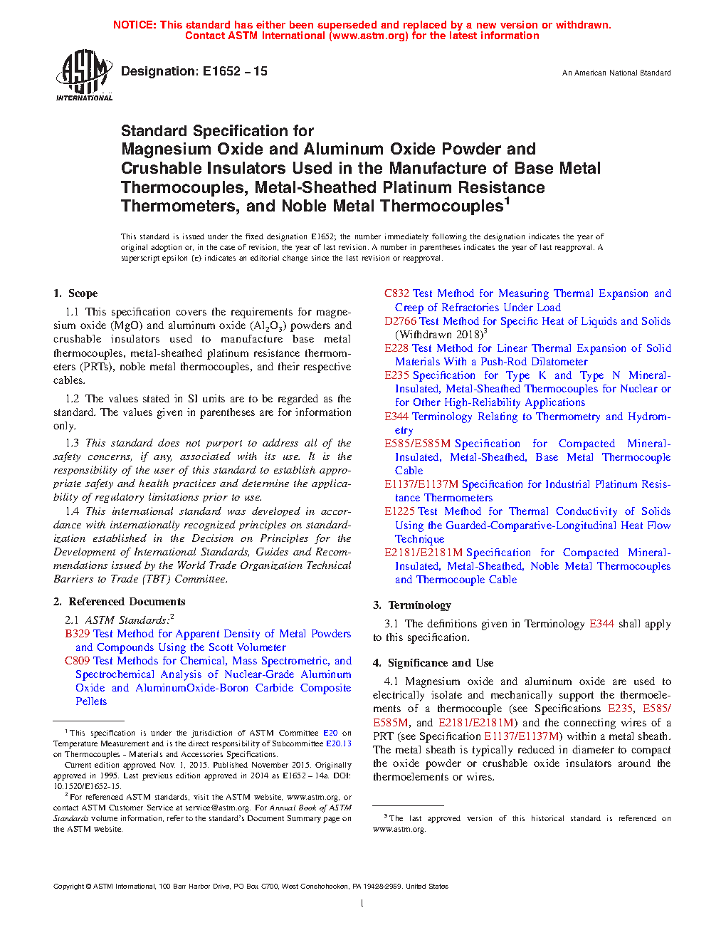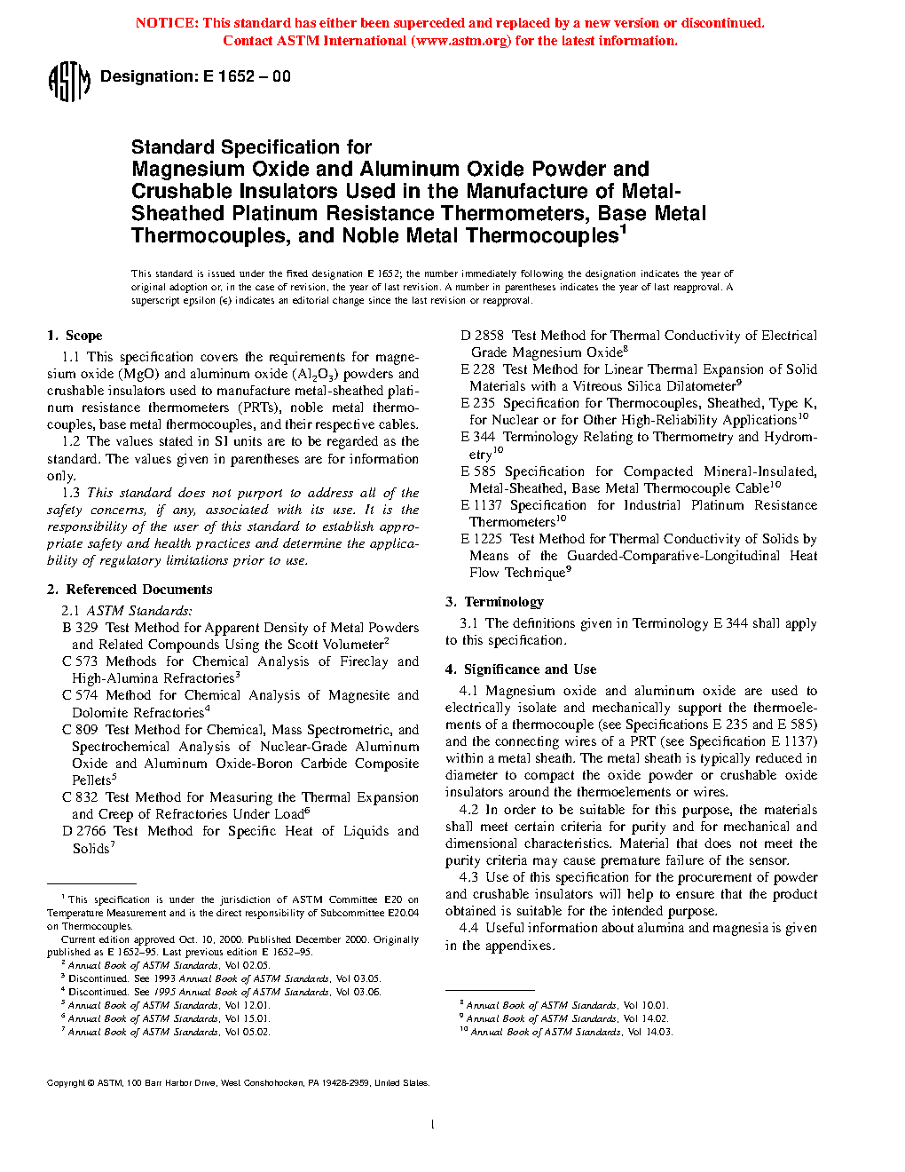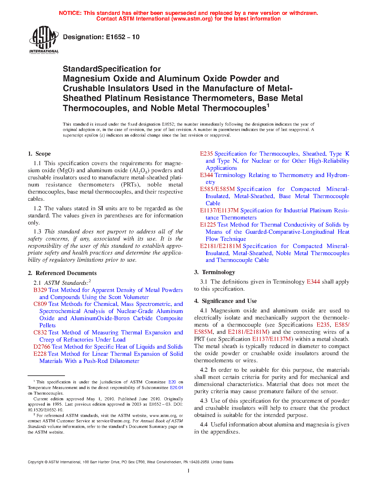 This specification covers the requirements for magnesium oxide (MgO) and aluminum oxide (Al2O3) powders and crushable insulators used to manufacture metal-sheathed platinum resistance thermometers (PRTs), noble metal thermocouples, base metal thermocouples, and their respective cables. The following test shall be performed to meet the requirements specified: breaking force test; wet chemical analysis; fusion calorimetric analysis; quantitative analysis; and density determination.
