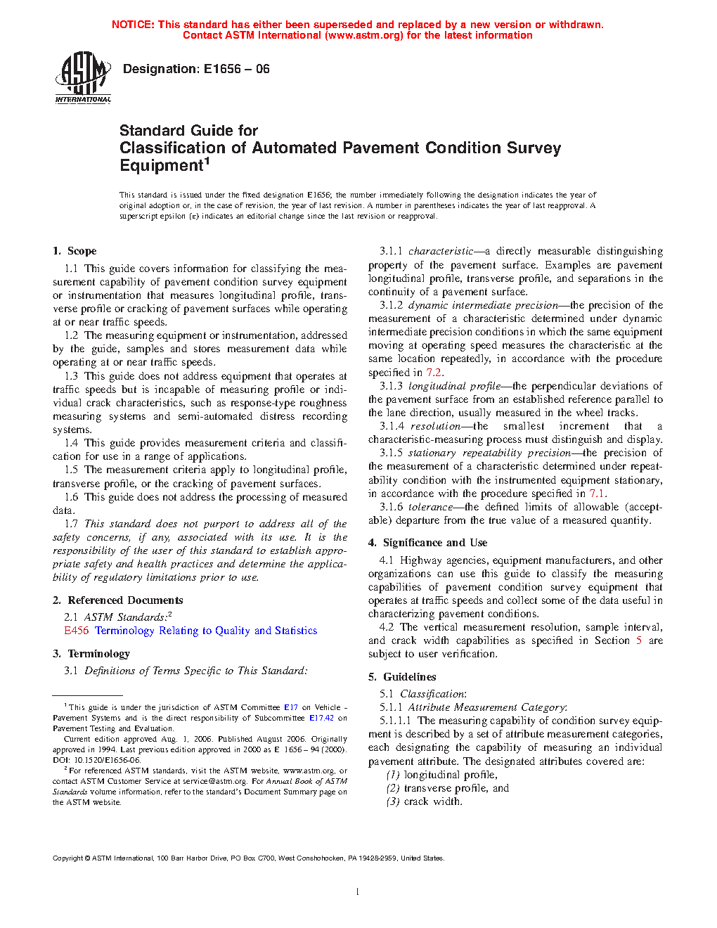 1.1 This guide covers information for classifying the measurement capability of pavement condition survey equipment or instrumentation that measures longitudinal profile, transverse profile or cracking of pavement surfaces while operating at or near traffic speeds.