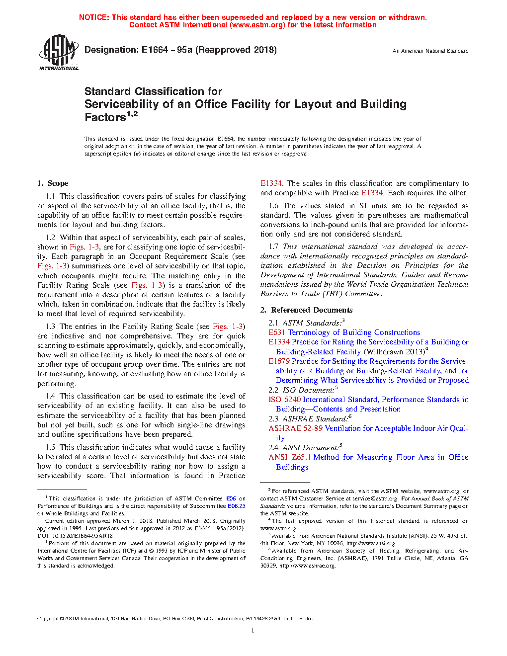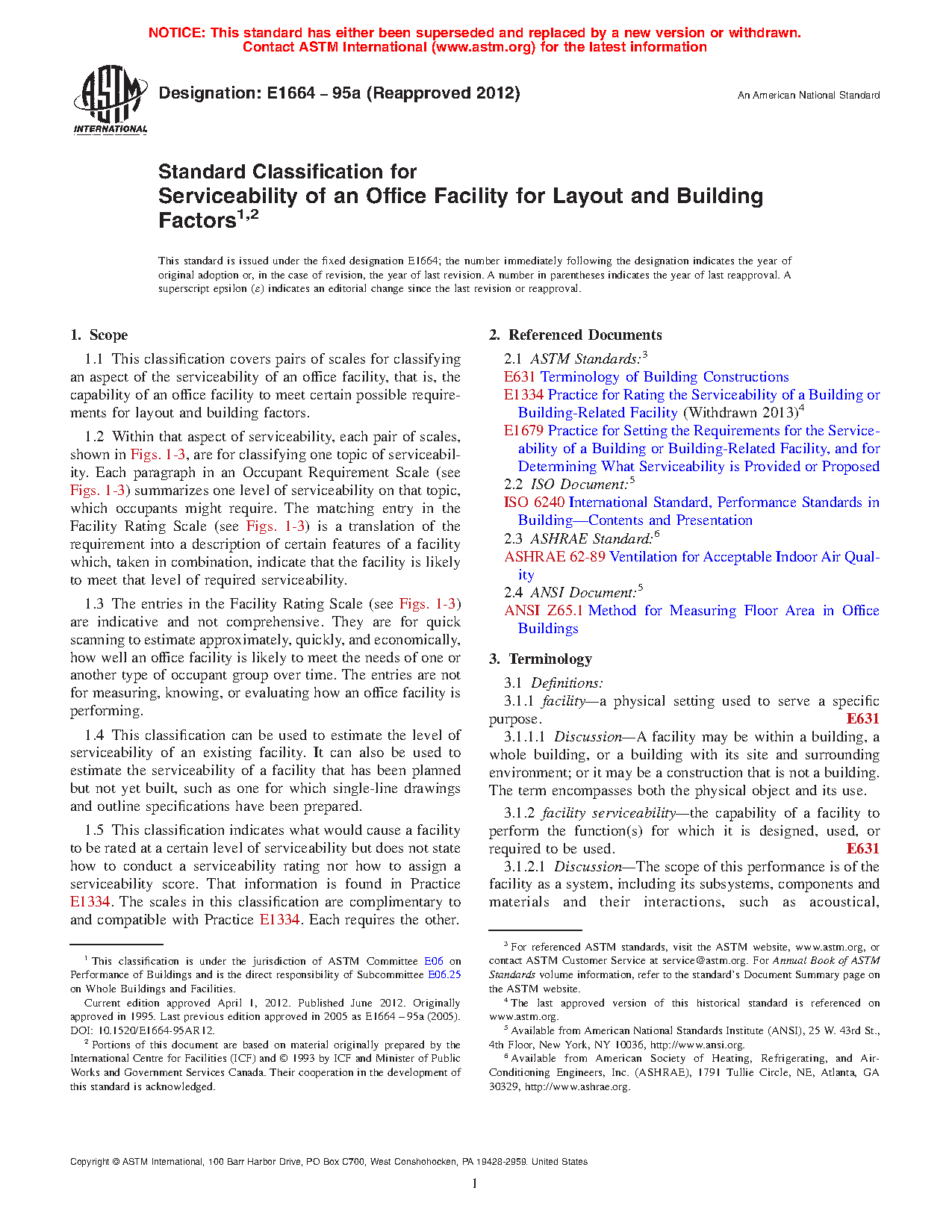 1.2 Within that aspect of serviceability, each matched set of scales, shown in Figs. 1-12, are for classifying one topic of serviceability. Each topic is typically broken down into two or more demand functions or supply features. Each paragraph in an Occupant Requirement Scale (see Figs. 1-12) summarizes one level of serviceability on that function, which occupants might require. The matching entry in the Facility Rating Scale (see Figs. 1-12) is a translation of the requirement into a description of certain features of a facility which, taken in combination, indicate that the facility is likely to meet that level of required serviceability.