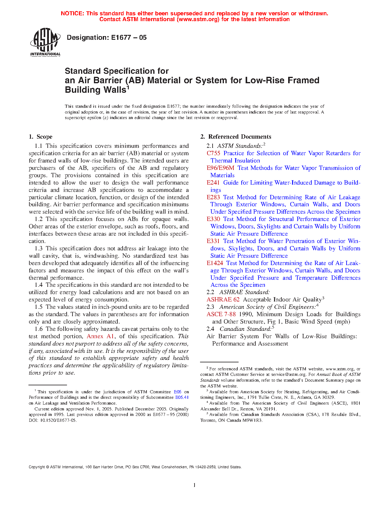 1.1 This specification covers minimum performances and specification criteria for an air retarder (AR) material or system for framed walls of low-rise buildings. The intended users are purchasers of the AR, specifiers of the AR and regulatory groups. The provisions contained in this specification are intended to allow the user to design the wall performance criteria and increase AR specifications to accommodate a particular climate location, function, or design of the intended building. Air retarder performance and specification minimums were selected with the service life of the building wall in mind.