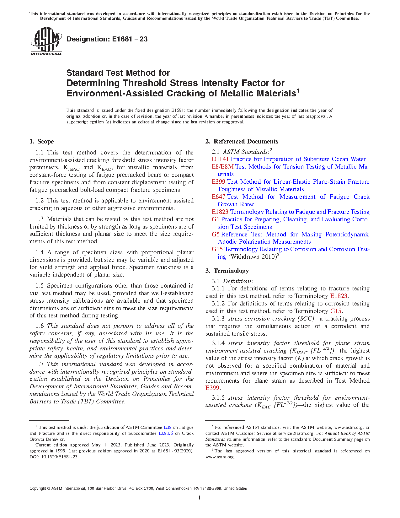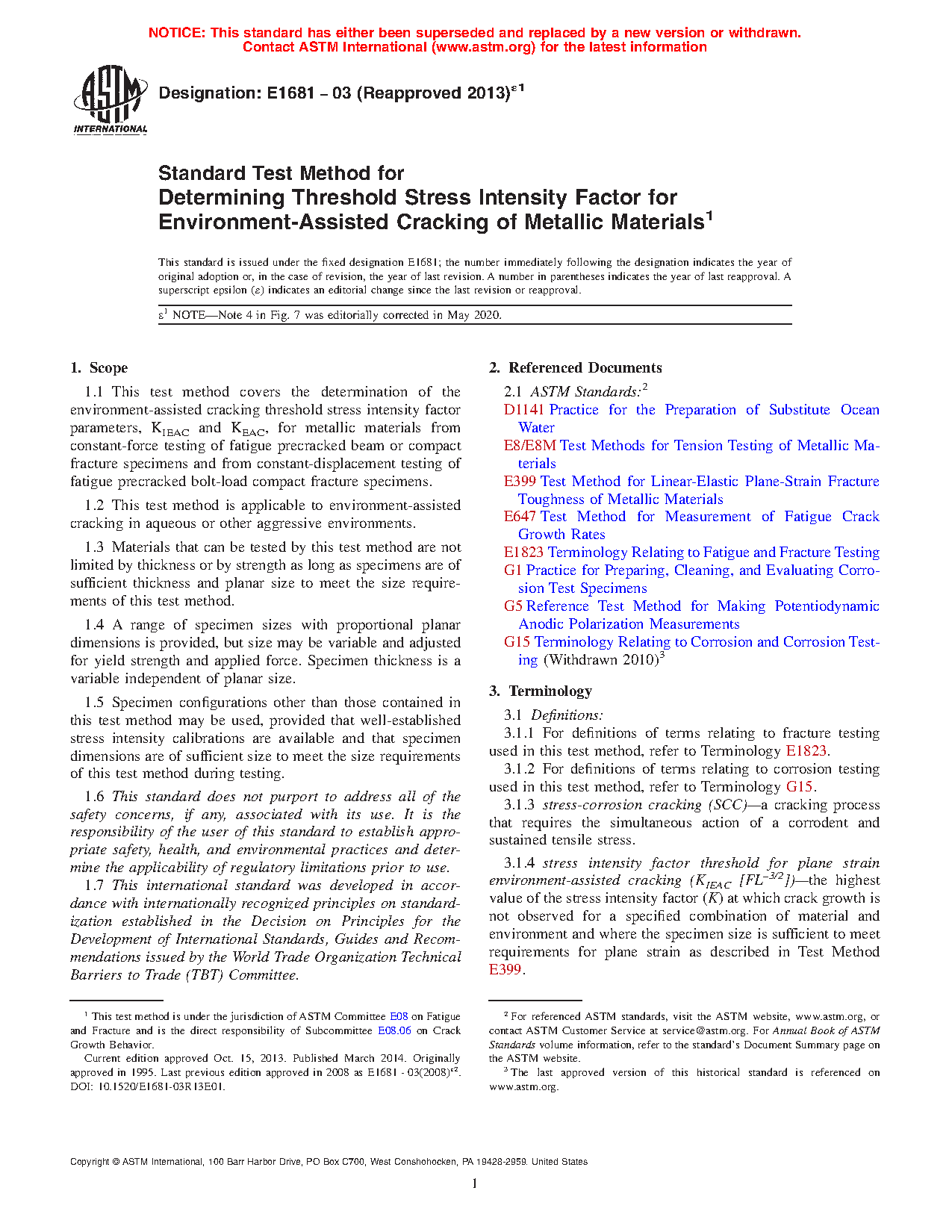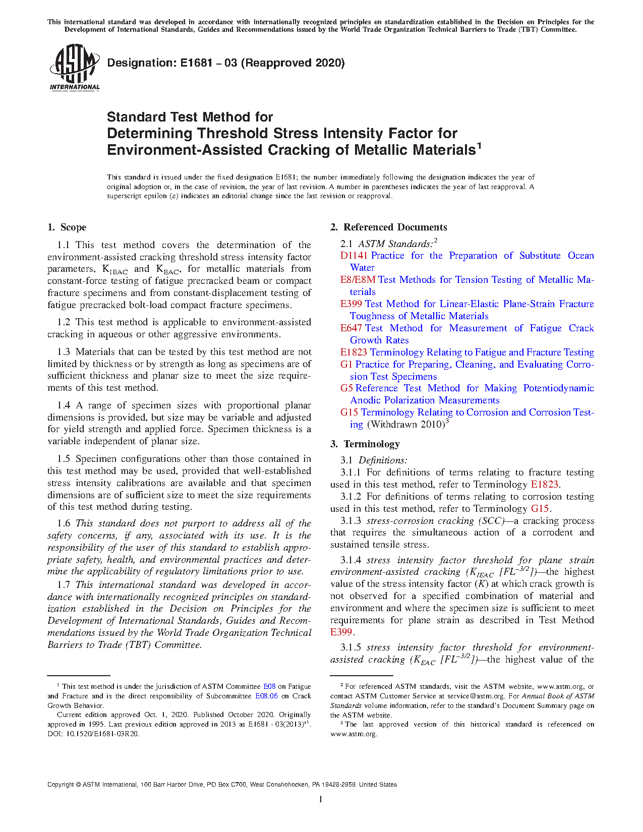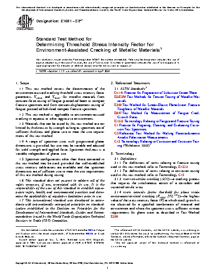 1.1 This test method covers the determination of the environment-assisted cracking threshold stress intensity factor parameters, KIEAC and KEAC, for metallic materials from constant-force testing of fatigue precracked beam or compact fracture specimens and from constant-displacement testing of fatigue precracked bolt-load compact fracture specimens.