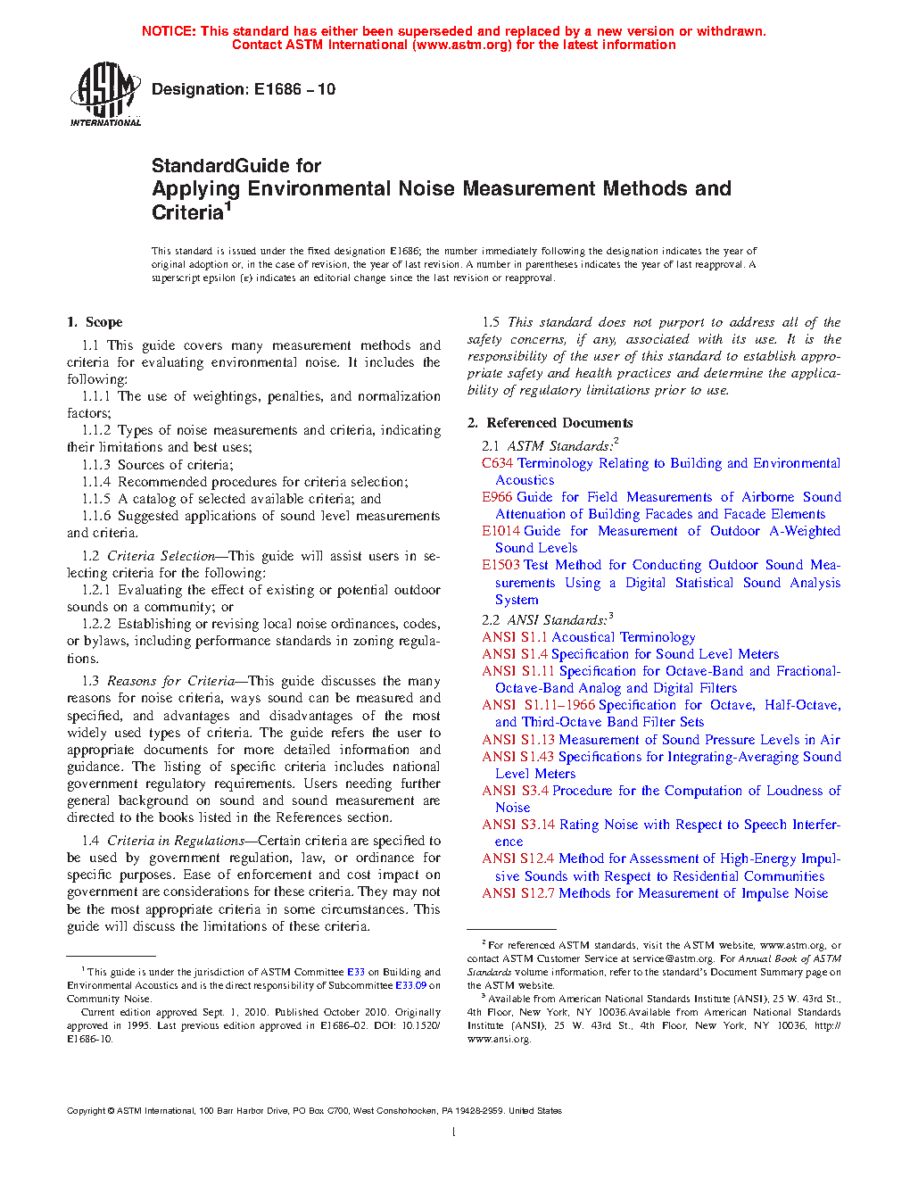 1.3 Reasons for Criteria—This guide discusses the many reasons for noise criteria, ways sound can be measured and specified, and advantages and disadvantages of the most widely used types of criteria. The guide refers the user to appropriate documents for more detailed information and guidance. The listing of specific criteria includes national government regulatory requirements. Users needing further general background on sound and sound measurement are directed to the books listed in the References section.