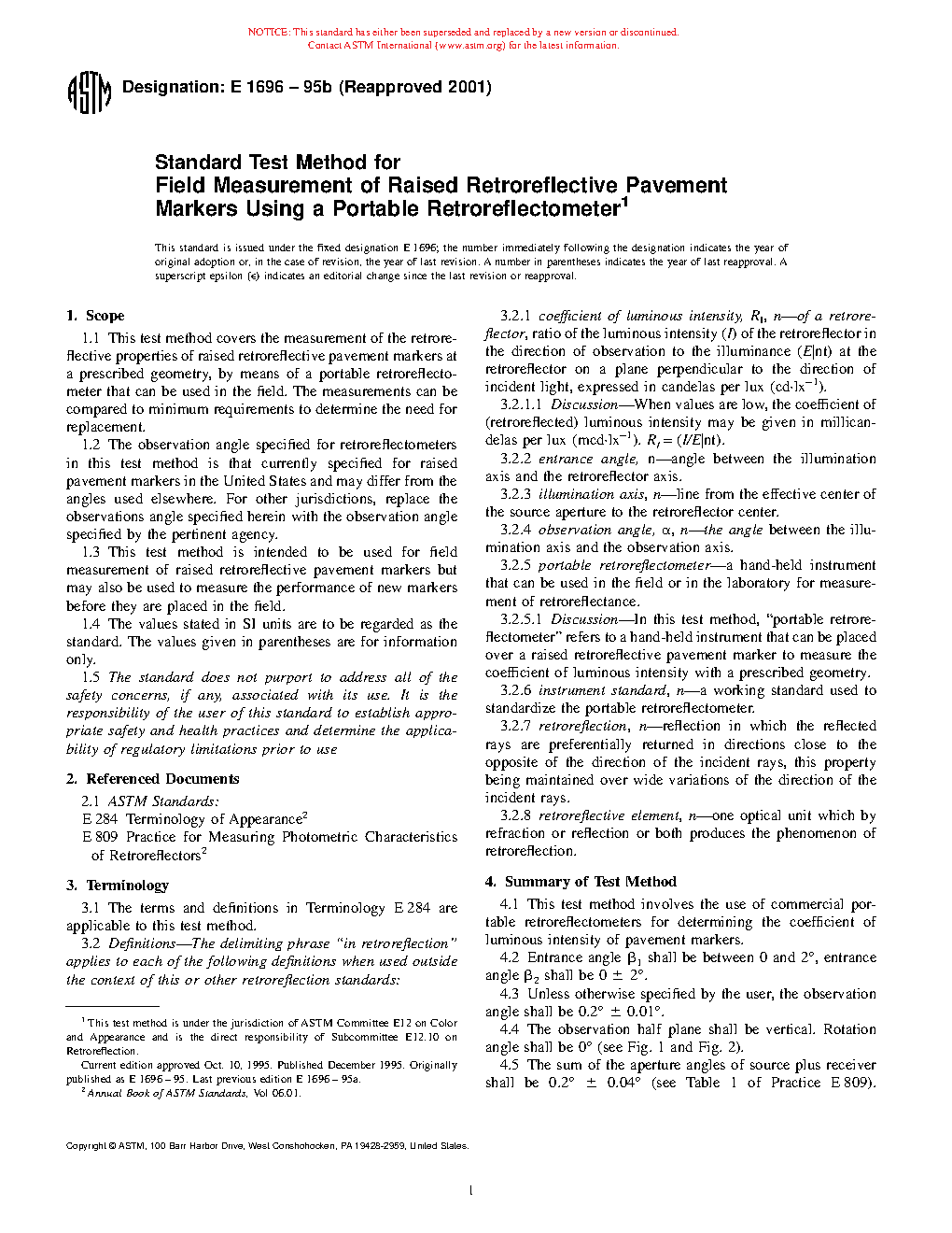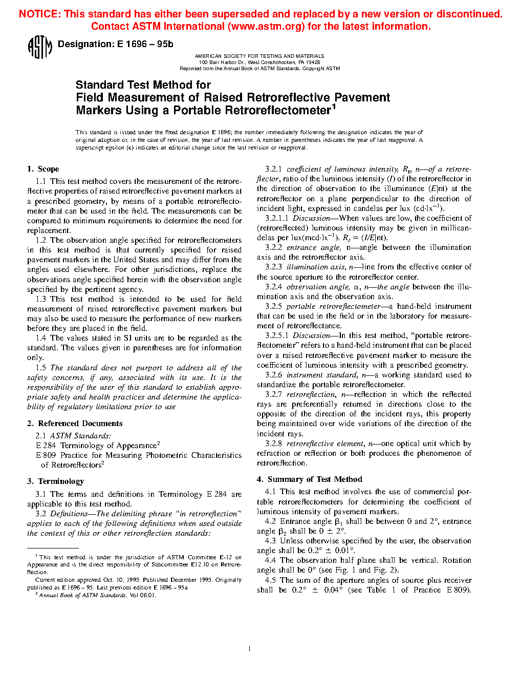 1.2 The observation angle specified for retroreflectometers in this test method is that currently specified for raised pavement markers in the United States and may differ from the angles used elsewhere. For other jurisdictions, replace the observations angle specified herein with the observation angle specified by the pertinent agency.