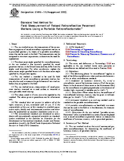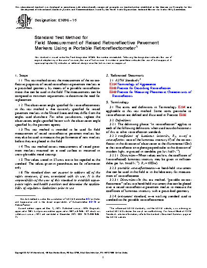 1.3 This test method is intended to be used for field measurement of raised retroreflective pavement markers but may also be used to measure the performance of new markers before they are placed in the field.