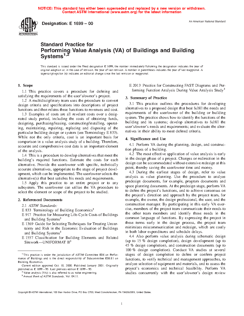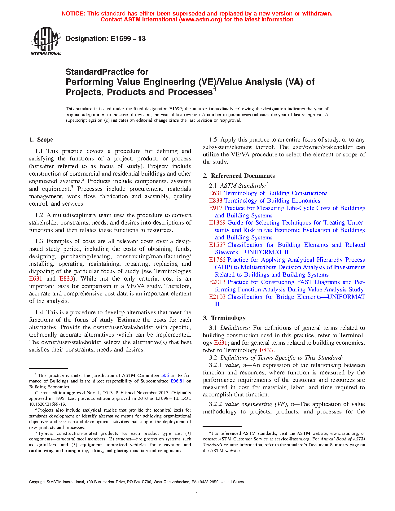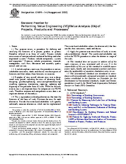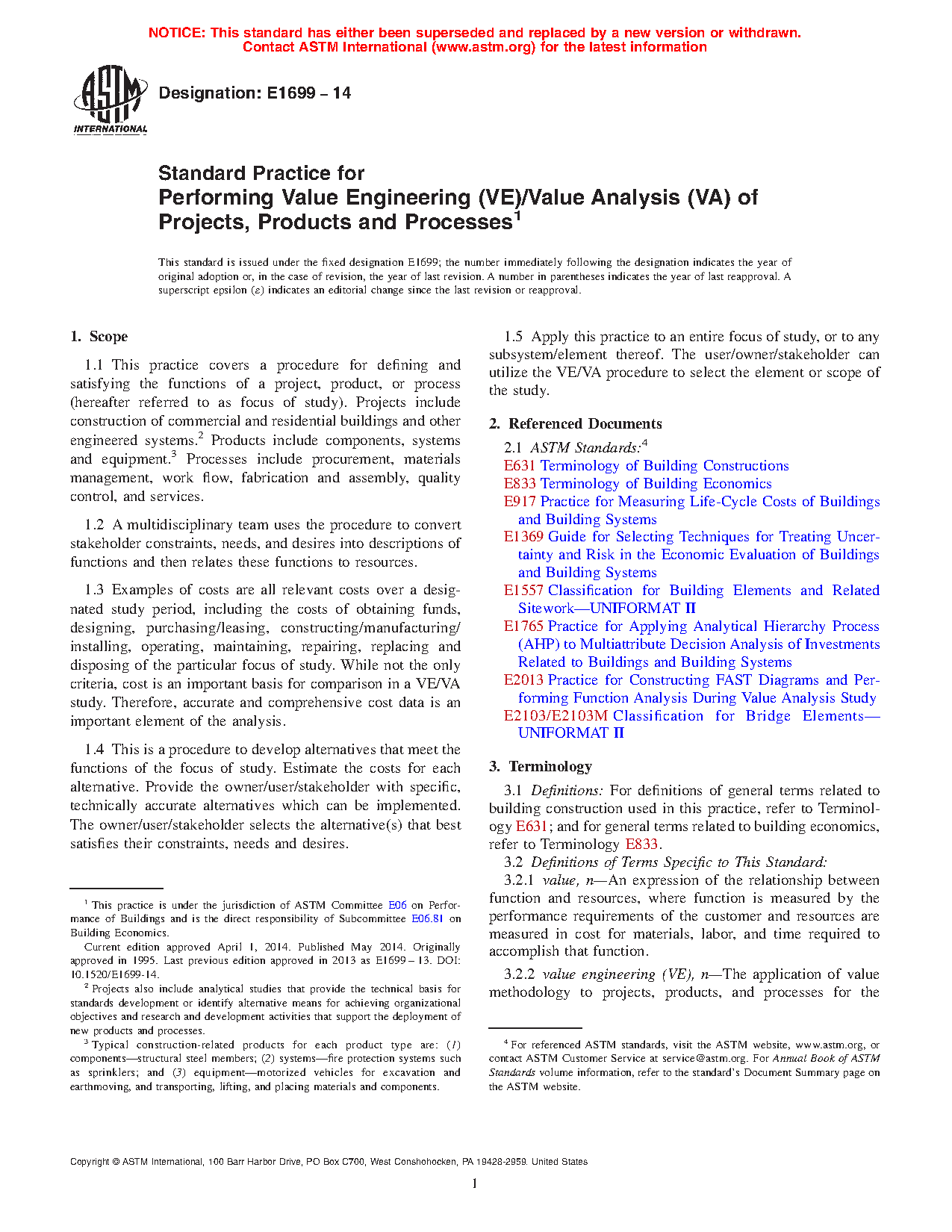 1.1 This practice covers a procedure for defining and satisfying the functions of a project, product, or process (hereafter referred to as focus of study). Projects include construction of commercial and residential buildings and other engineered systems.2 Products include components, systems and equipment.3 Processes include procurement, materials management, work flow, fabrication and assembly, quality control, and services.