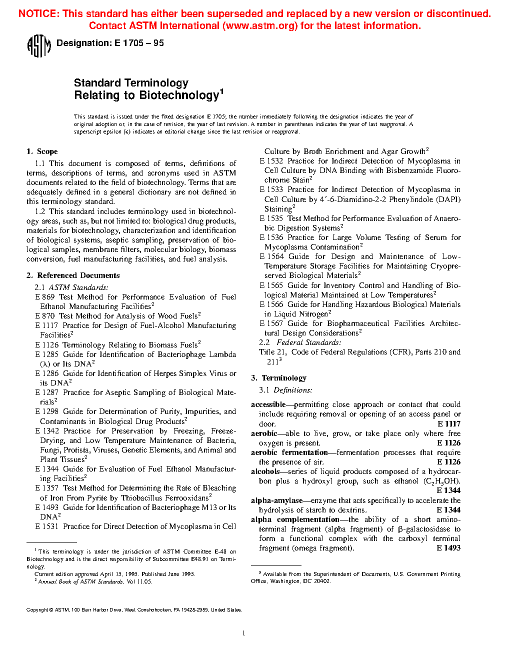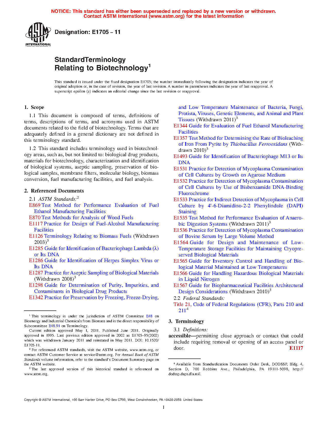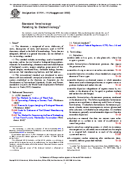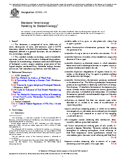 1.1 This document is composed of terms, definitions of terms, descriptions of terms, and acronyms used in ASTM documents related to the field of biotechnology. Terms that are adequately defined in a general dictionary are not defined in this terminology standard.