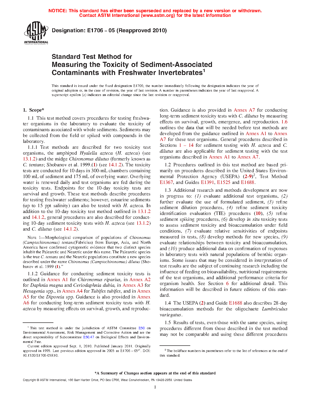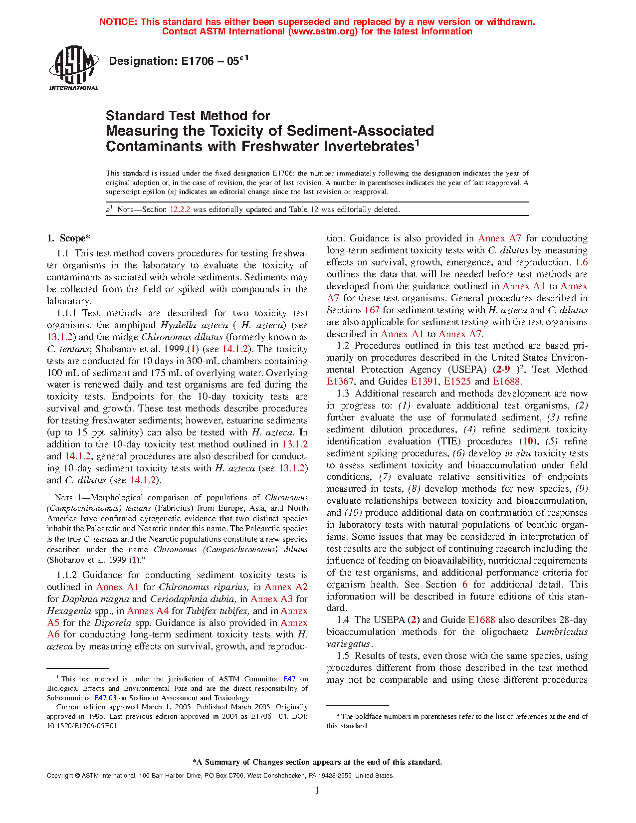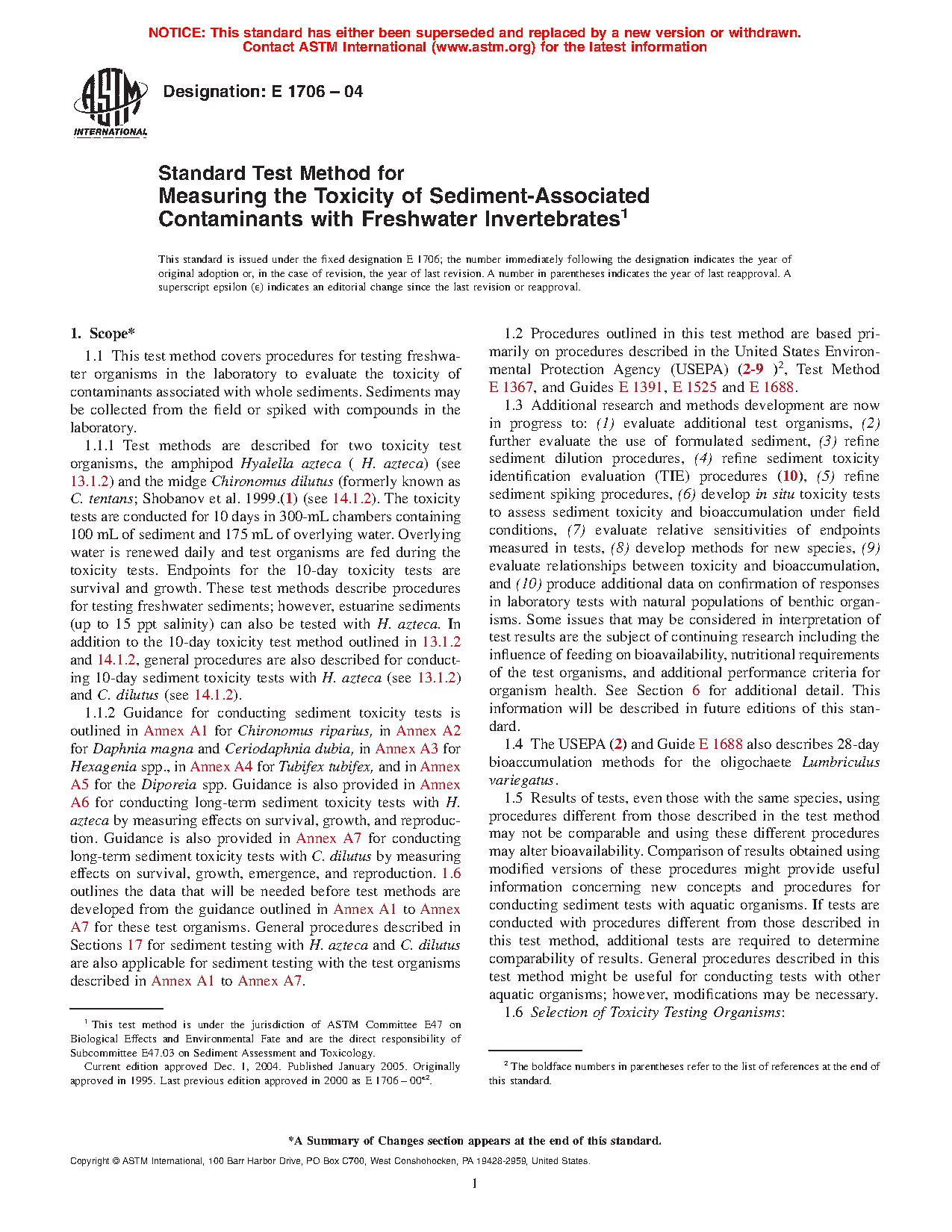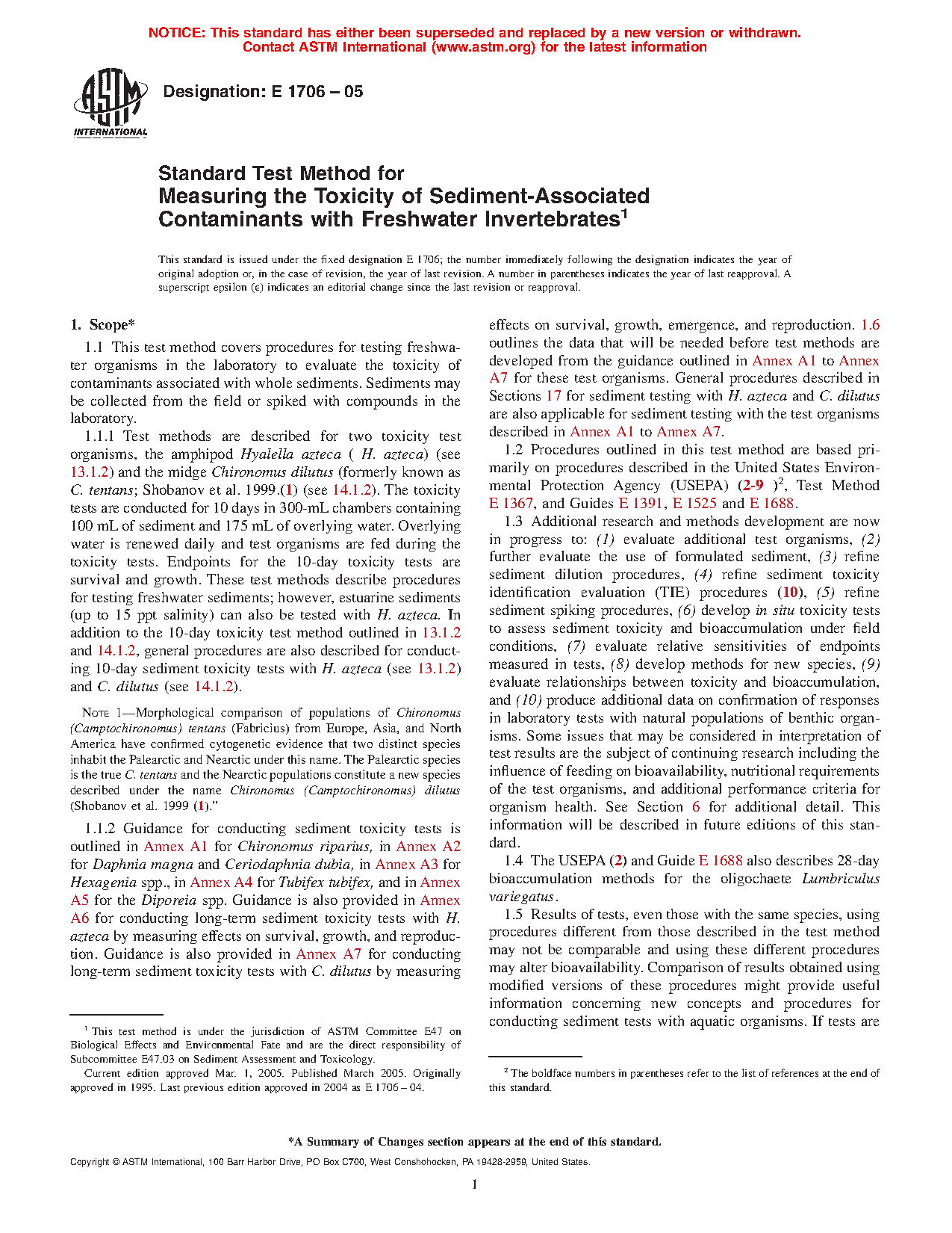 1.7 Limitations—While some safety considerations are included in this standard, it is beyond the scope of this standard to encompass all safety requirements necessary to conduct sediment toxicity tests.