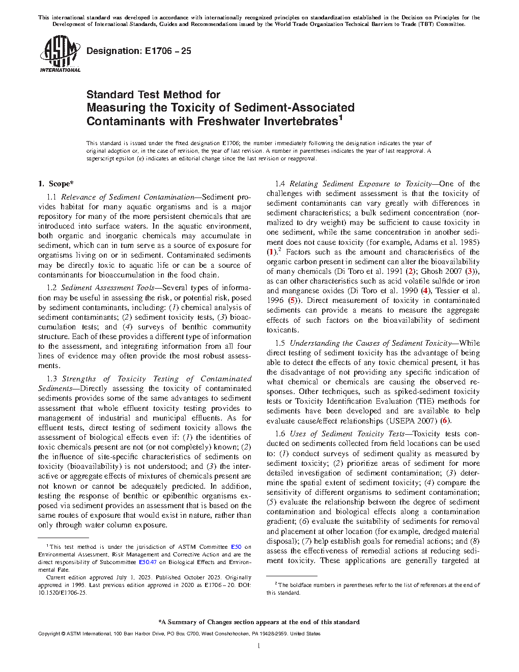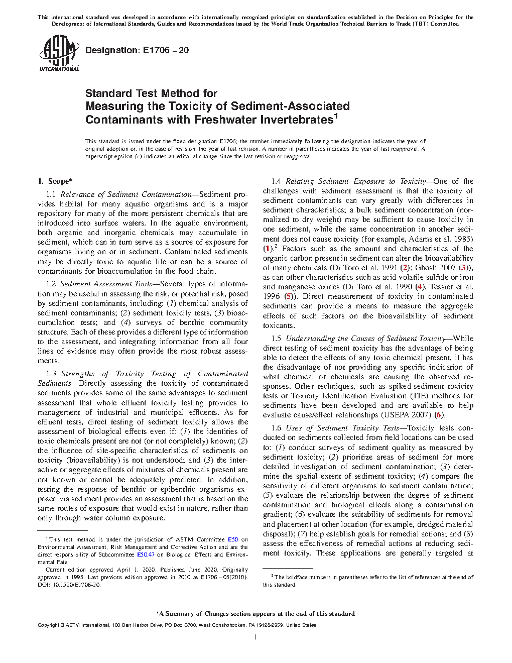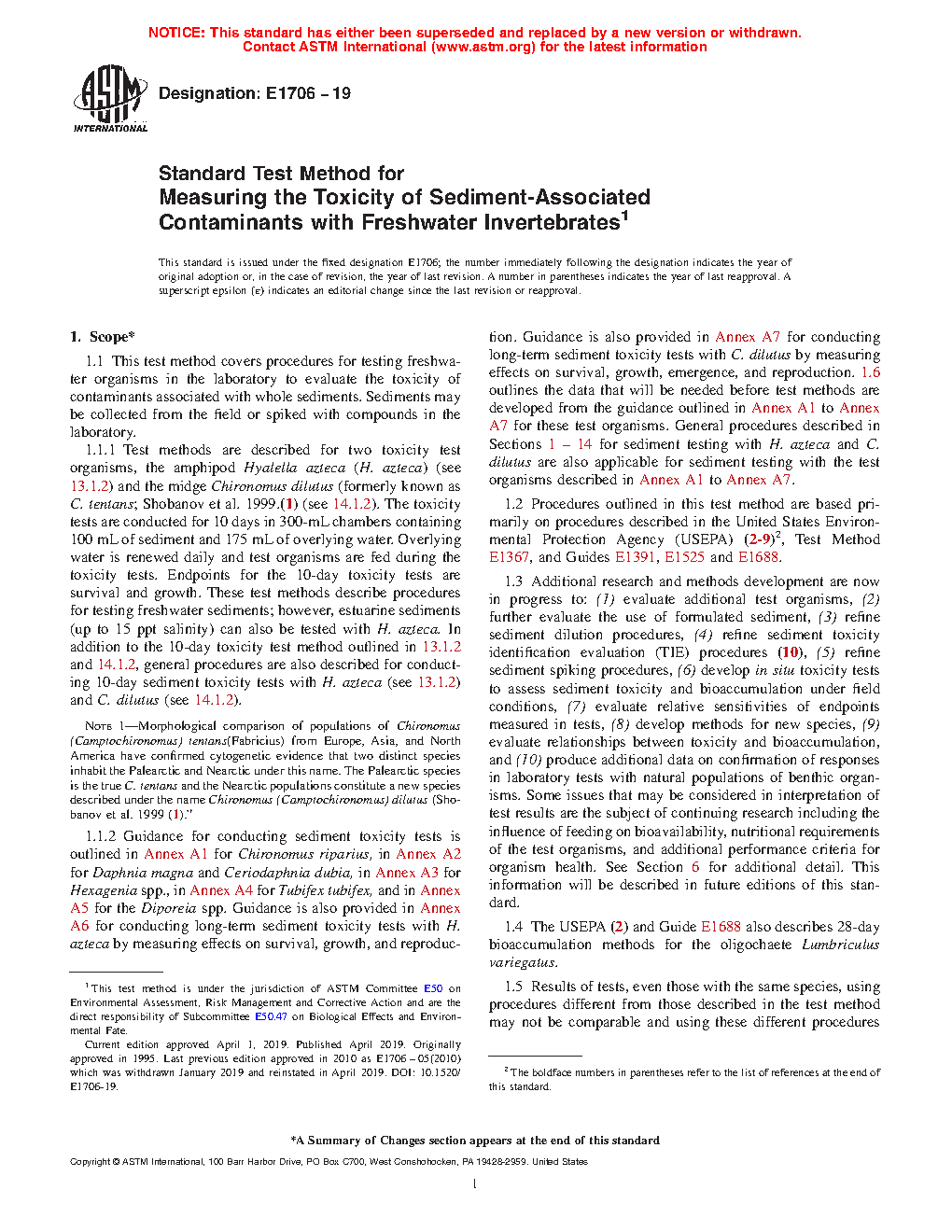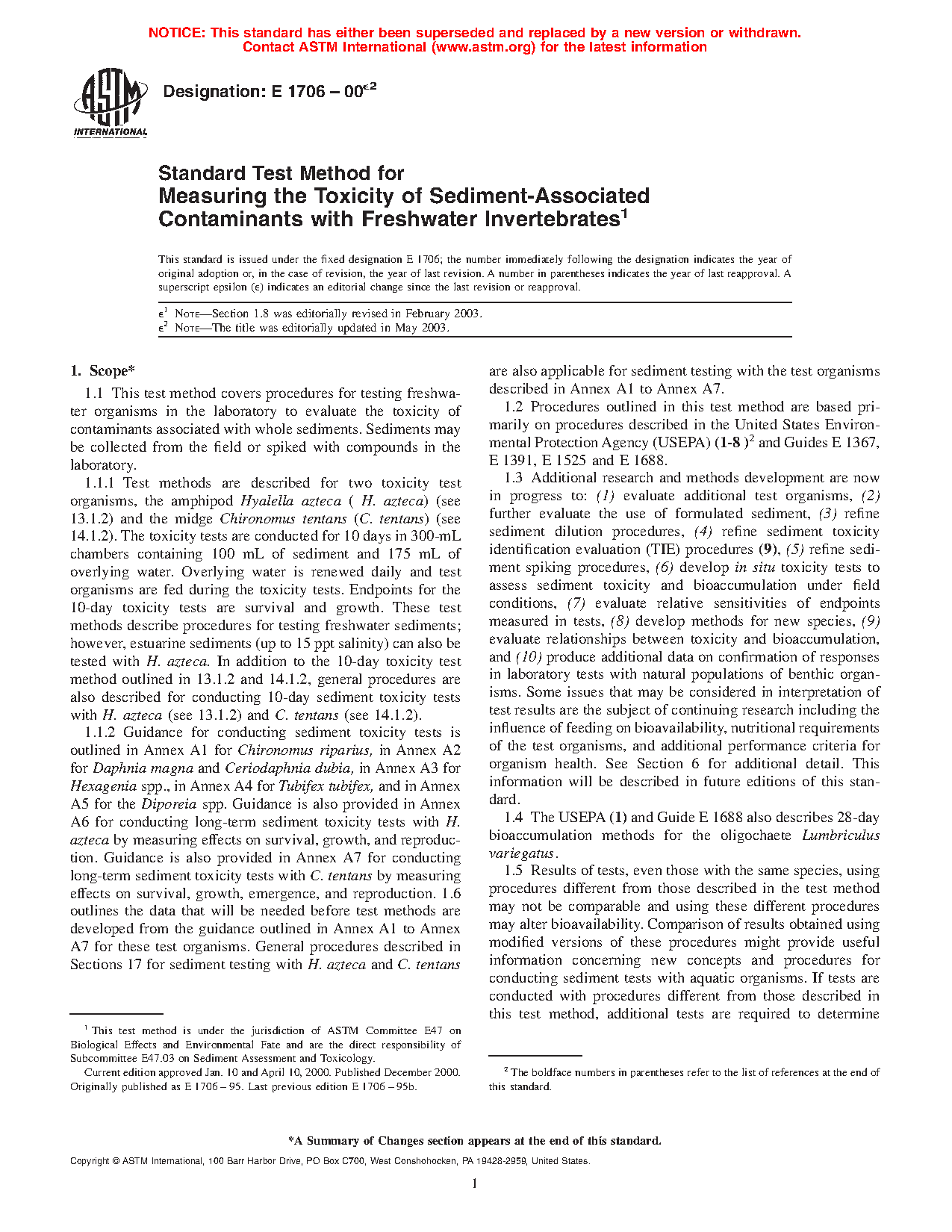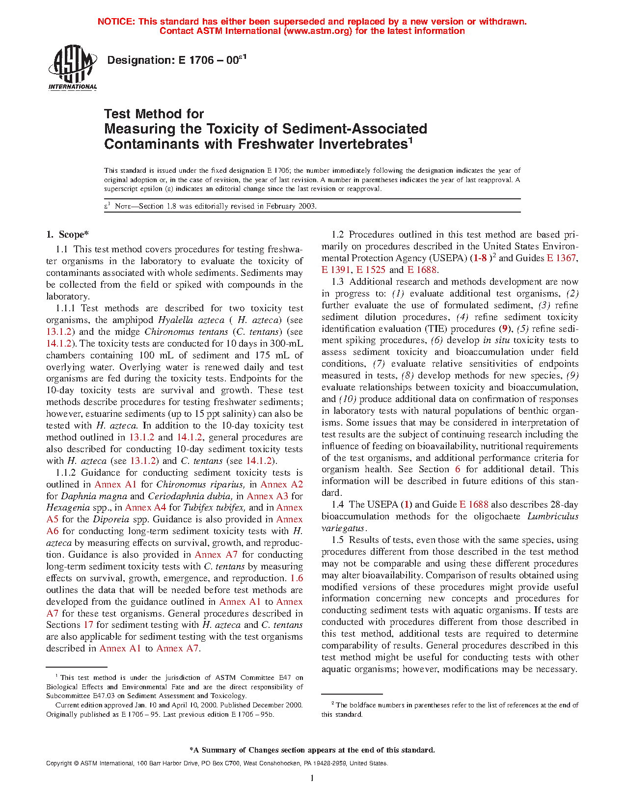 1.7 Limitations—While some safety considerations are included in this standard, it is beyond the scope of this standard to encompass all safety requirements necessary to conduct sediment toxicity tests.