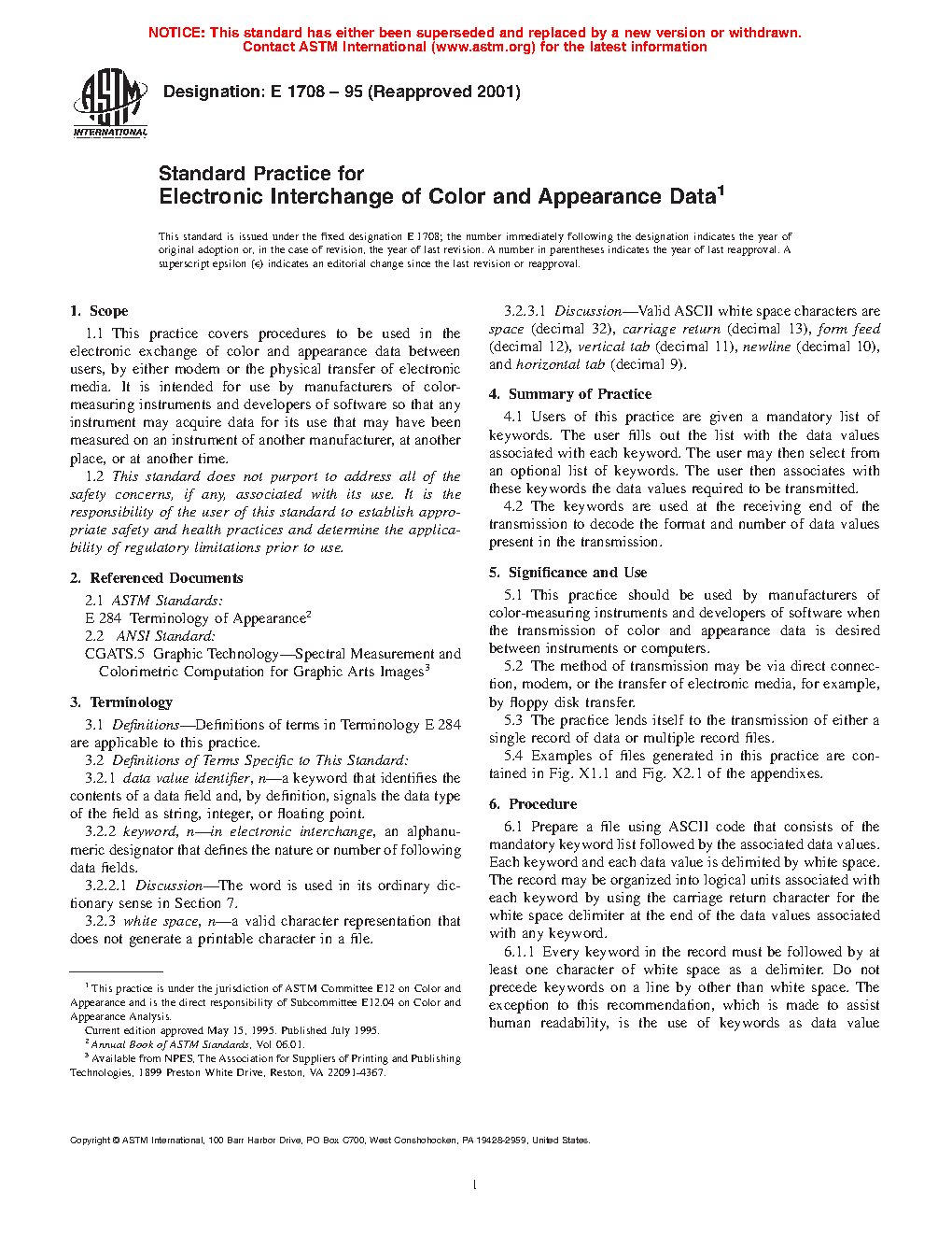 1.1 This practice covers procedures to be used in the electronic exchange of color and appearance data between users, by either modem or the physical transfer of electronic media. It is intended for use by manufacturers of color-measuring instruments and developers of software so that any instrument may acquire data for its use that may have been measured on an instrument of another manufacturer, at another place, or at another time.