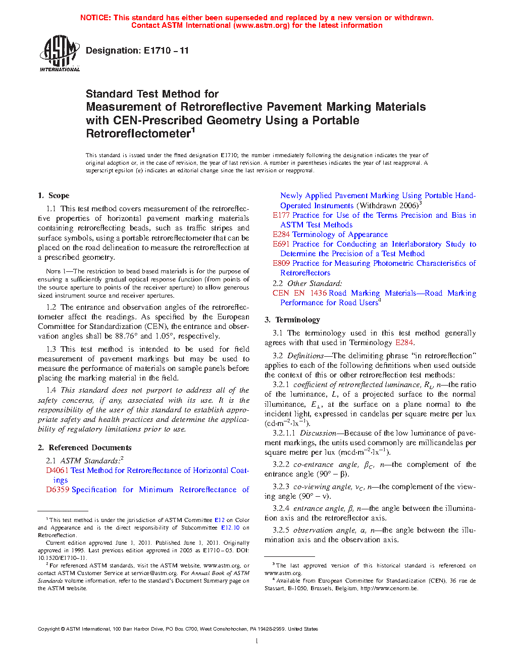 1.2 The entrance and observation angles of the retroreflectometer affect the readings. As specified by the European Committee for Standardization (CEN), the entrance and observation angles shall be 88.76° and 1.05°, respectively.