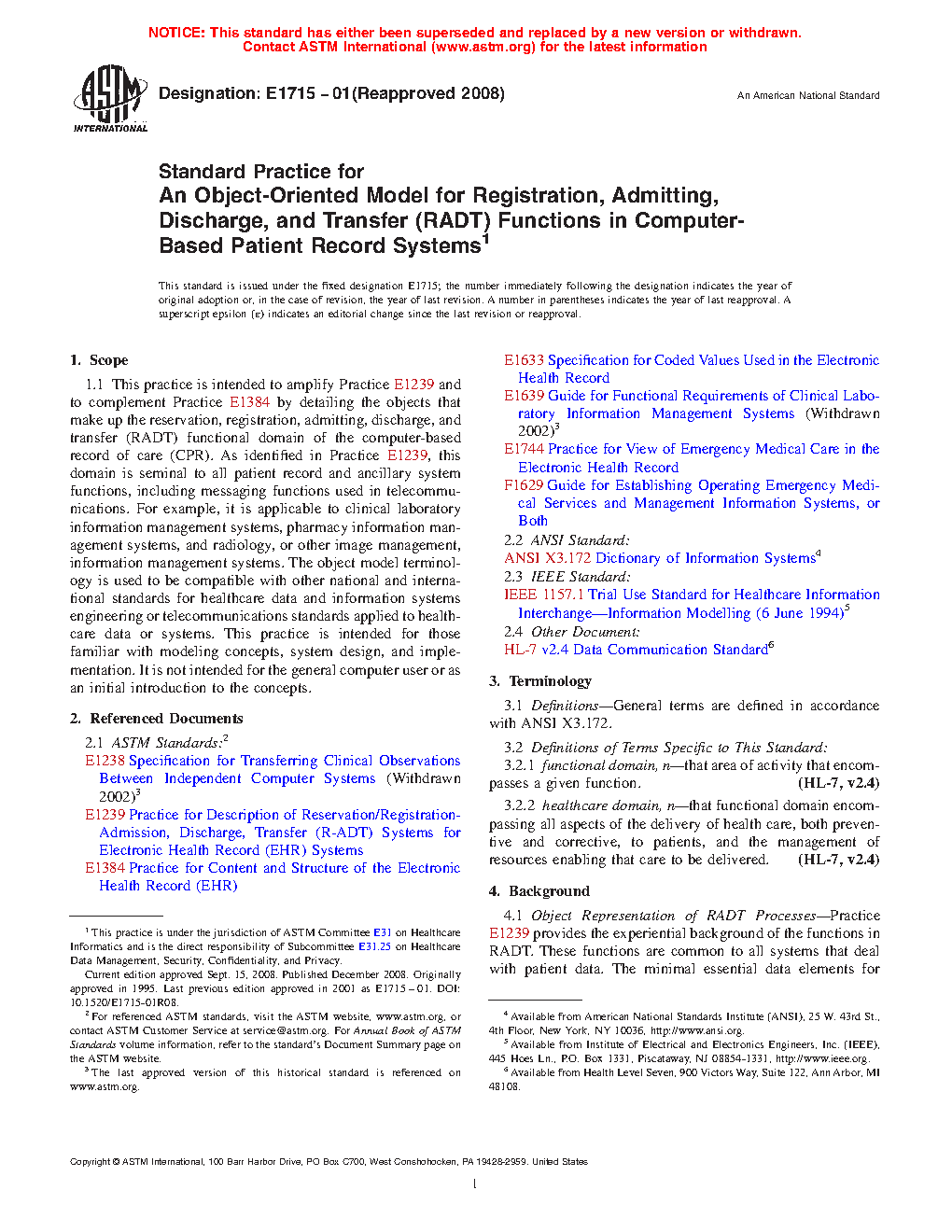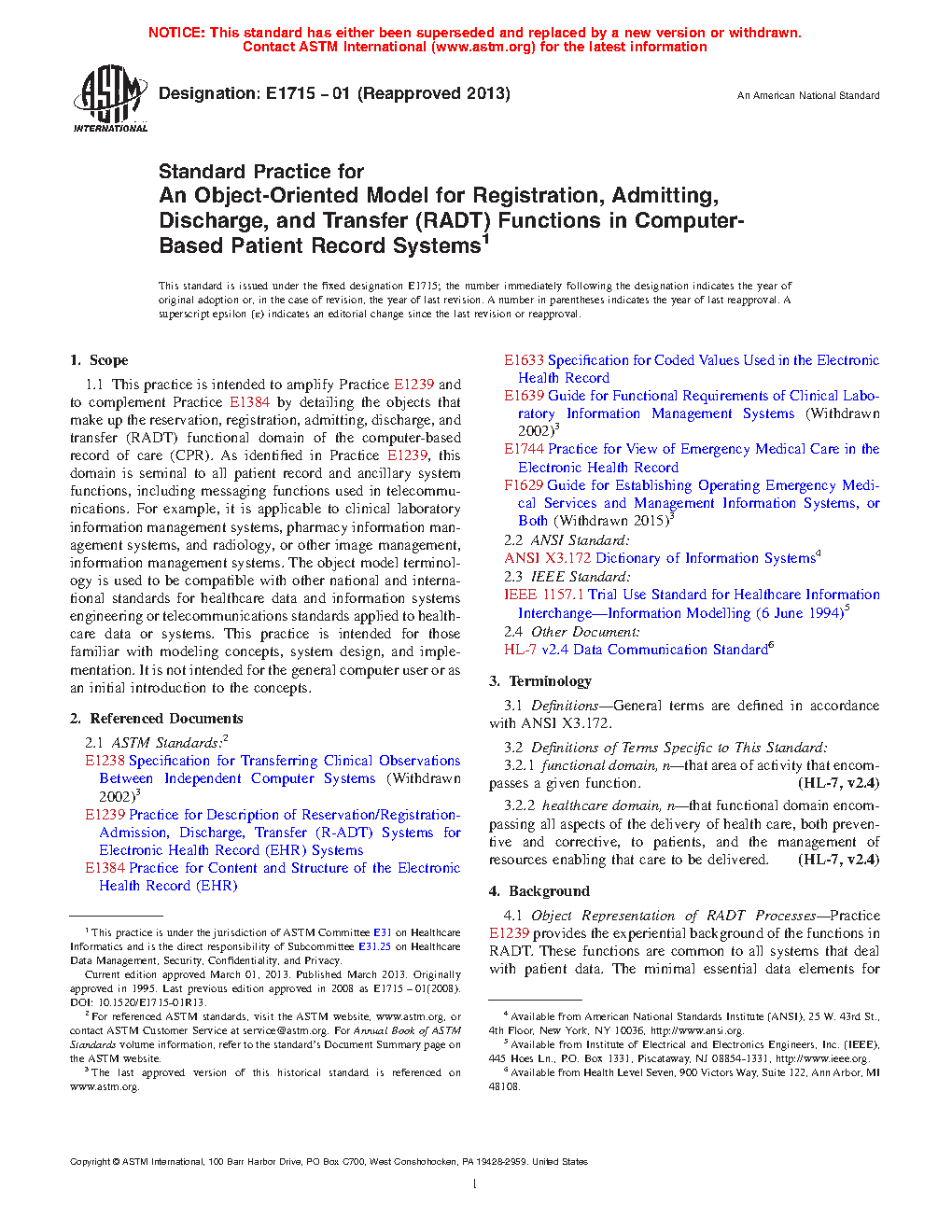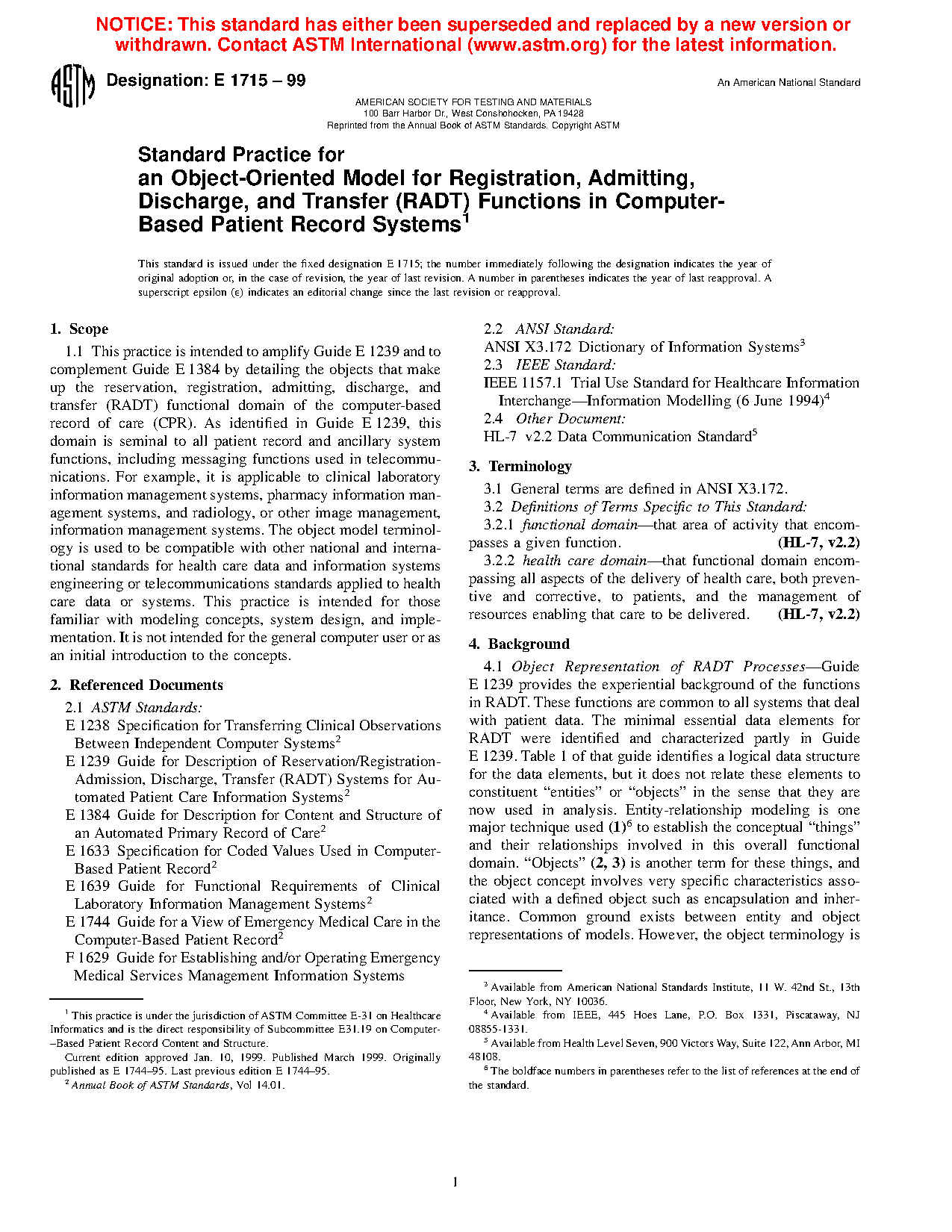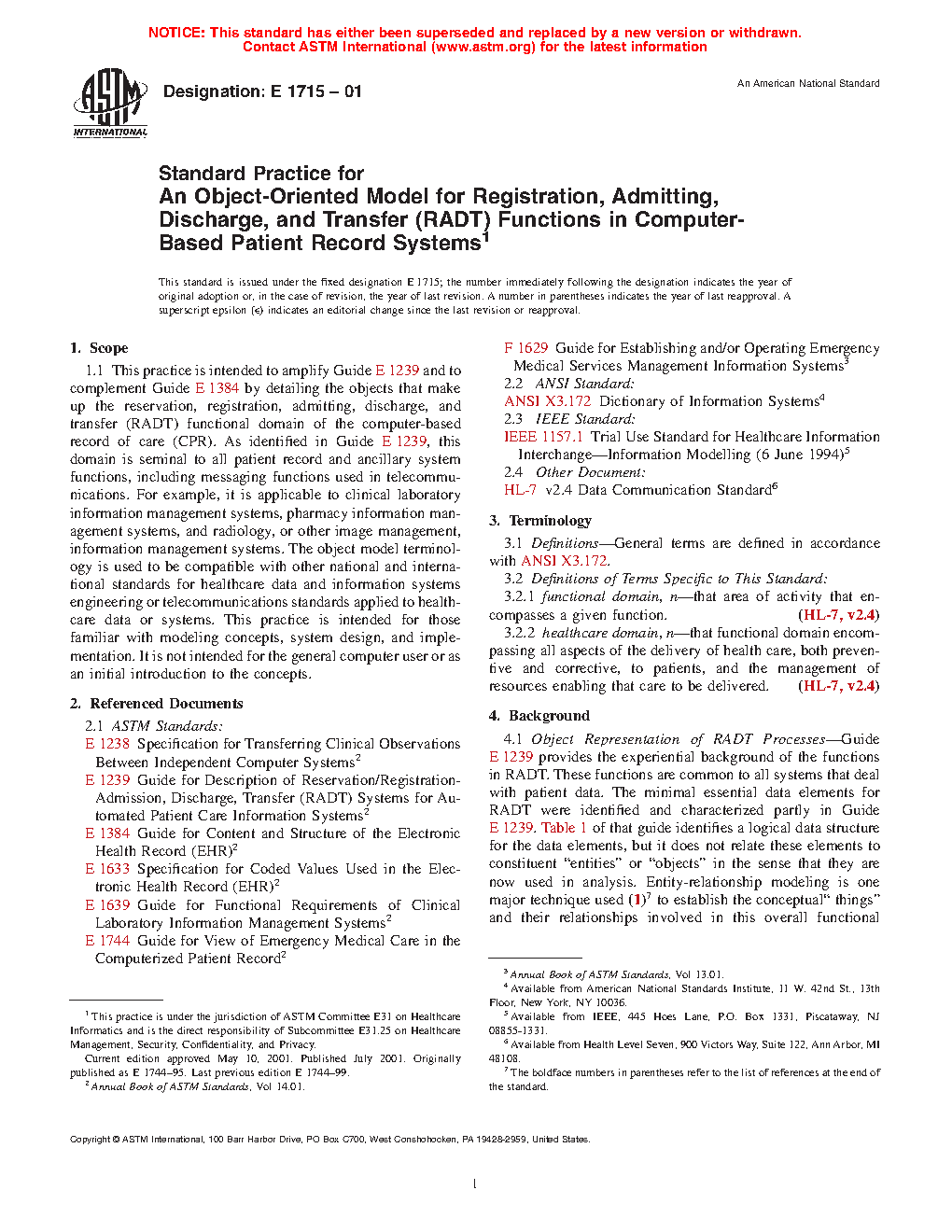 1.1 This practice is intended to amplify Guide E 1239 and to complement Guide E 1384 by detailing the objects that make up the reservation, registration, admitting, discharge, and transfer (RADT) functional domain of the computer-based record of care (CPR). As identified in Guide E1239, this domain is seminal to all patient record and ancillary system functions, including messaging functions used in telecommunications. For example, it is applicable to clinical laboratory information management systems, pharmacy information management systems, and radiology, or other image management, information management systems. The object model terminology is used to be compatible with other national and international standards for healthcare data and information systems engineering or telecommunications standards applied to healthcare data or systems. This practice is intended for those familiar with modeling concepts, system design, and implementation. It is not intended for the general computer user or as an initial introduction to the concepts.
