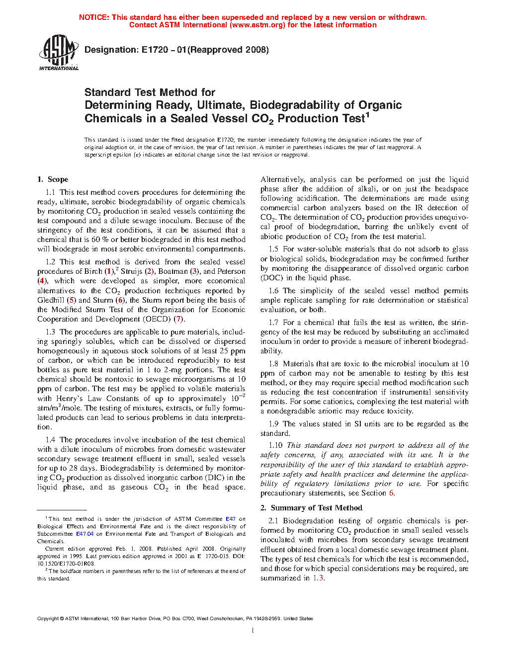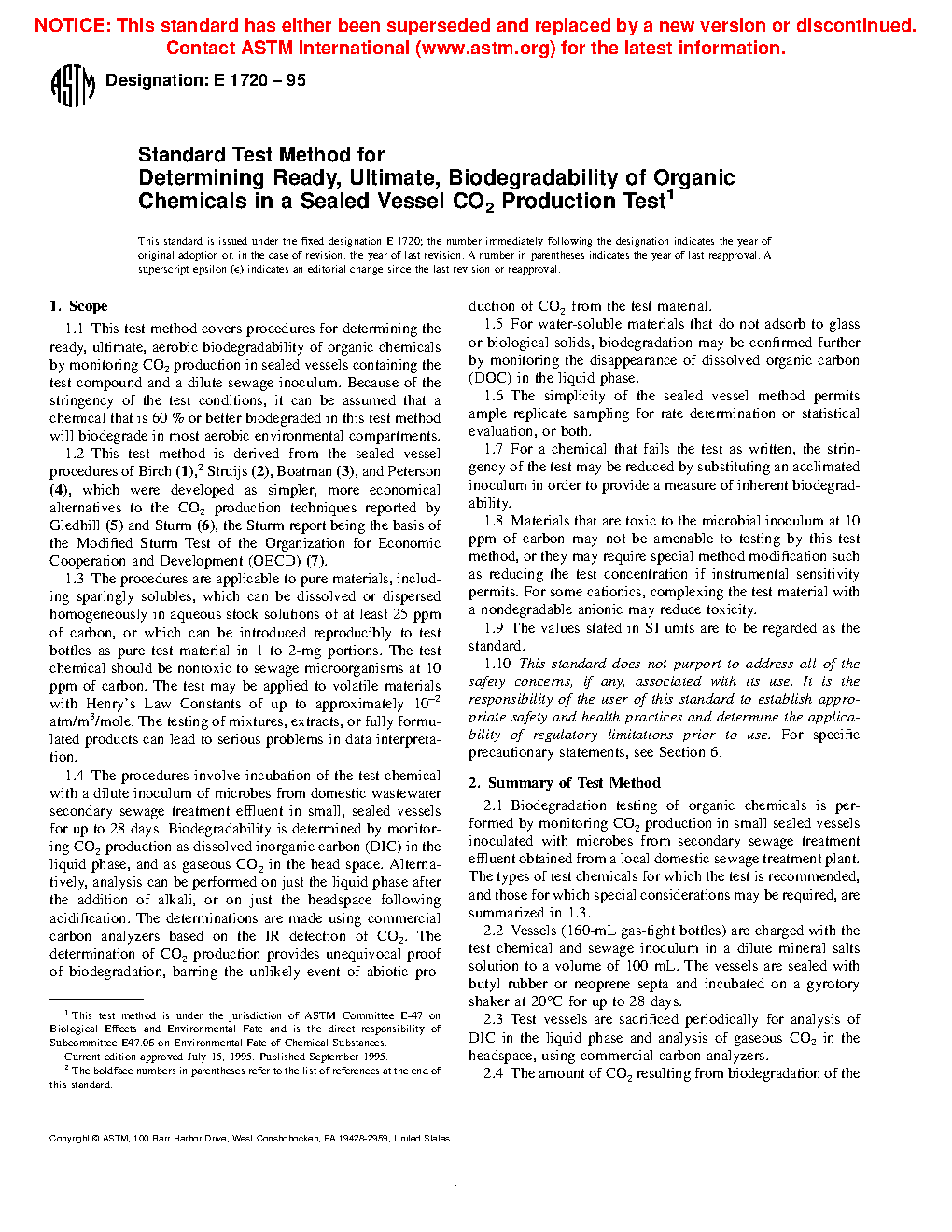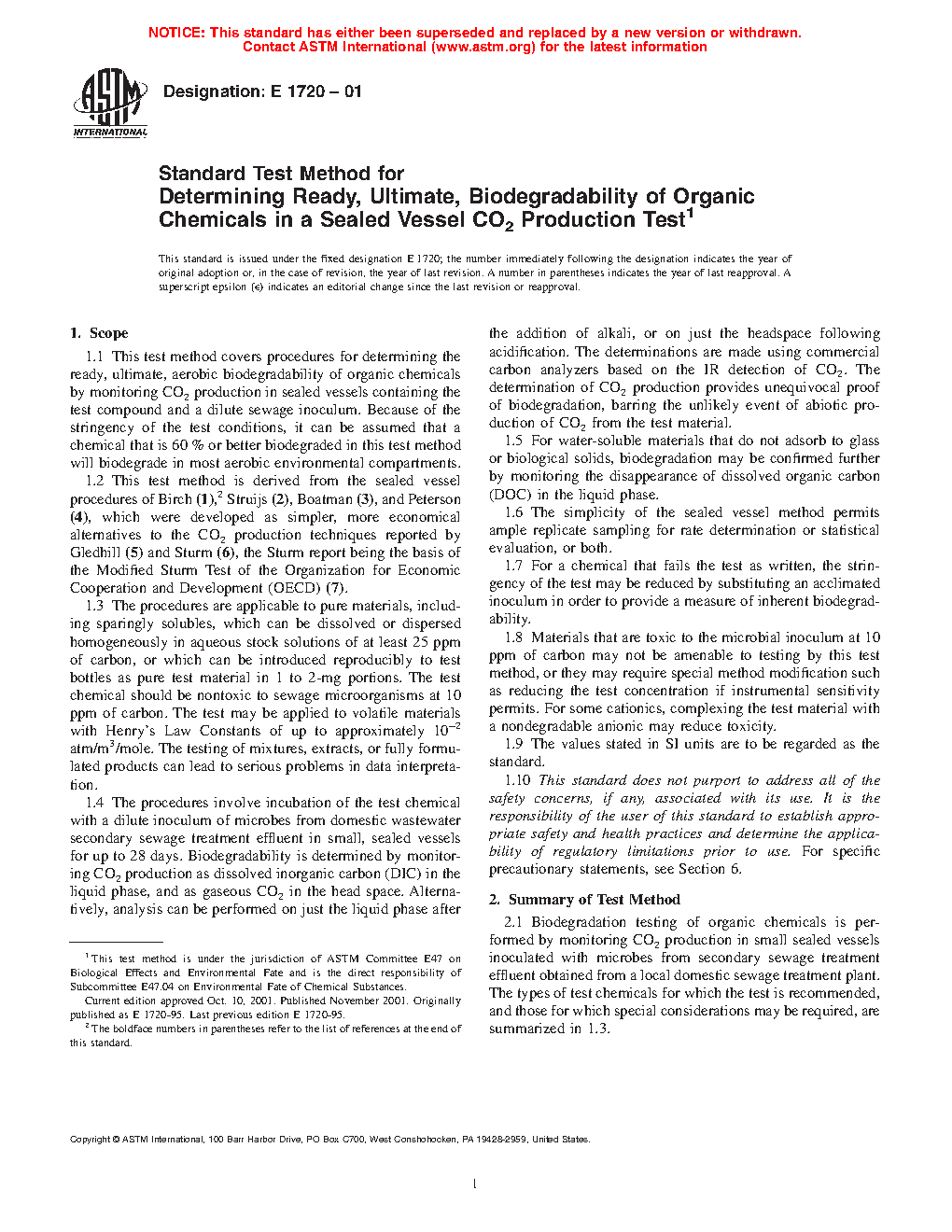 1.4 The procedures involve incubation of the test chemical with a dilute inoculum of microbes from domestic wastewater secondary sewage treatment effluent in small, sealed vessels for up to 28 days. Biodegradability is determined by monitoring CO2 production as dissolved inorganic carbon (DIC) in the liquid phase, and as gaseous CO2 in the head space. Alternatively, analysis can be performed on just the liquid phase after the addition of alkali, or on just the headspace following acidification. The determinations are made using commercial carbon analyzers based on the IR detection of CO2 . The determination of CO2 production provides unequivocal proof of biodegradation, barring the unlikely event of abiotic production of CO2 from the test material.
