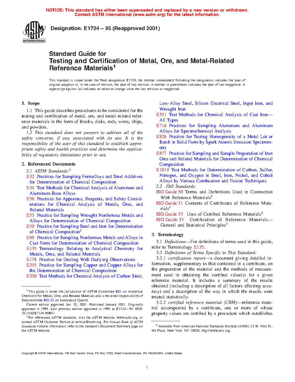 This guide describes the suggested procedures for the preparation, testing, and certification of reference materials (RMs) to be used in the calibration, verification, and control of methods used to characterize the chemical composition of metals, ores, and related materials.