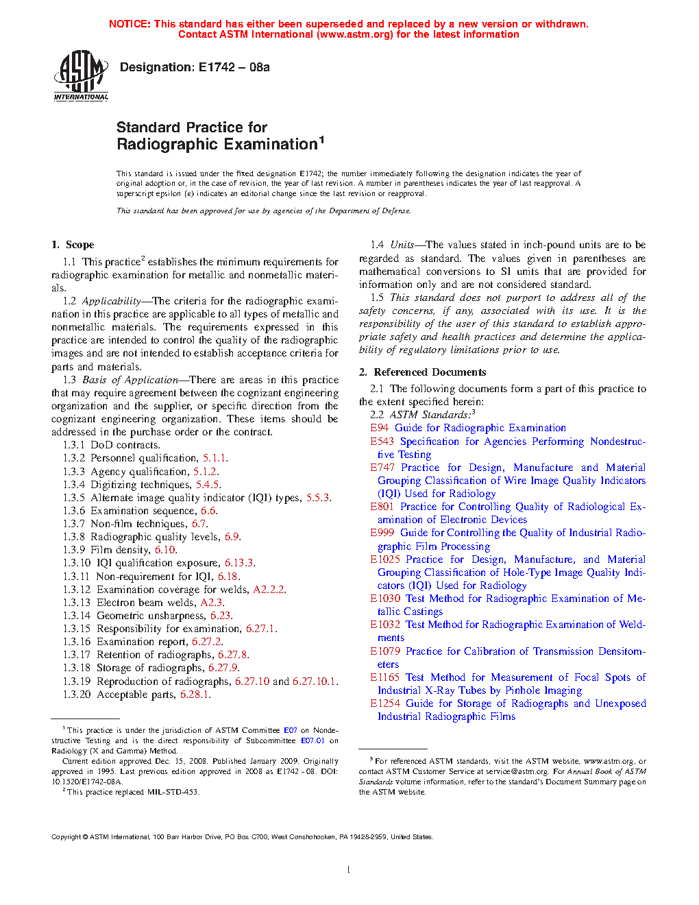 This practice establishes the basic parameters for the application and control of the radiographic method. This practice is written so it can be specified on the engineering drawing, specification, or contract. It is not a detailed how-to procedure to be used by the NDT facility and, therefore, must be supplemented by a detailed procedure (see 6.1). Test Methods E1030, E1032, and E1416 contain information to help develop detailed technique/procedure requirements.