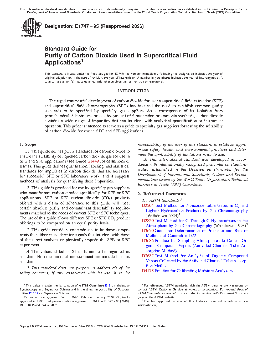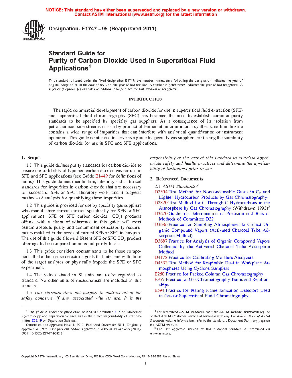 1.1 This guide defines purity standards for carbon dioxide to ensure the suitability of liquefied carbon dioxide gas for use in SFE and SFC applications (see Guide E1449 for definitions of terms). This guide defines quantitation, labeling, and statistical standards for impurities in carbon dioxide that are necessary for successful SFE or SFC laboratory work, and it suggests methods of analysis for quantifying these impurities.