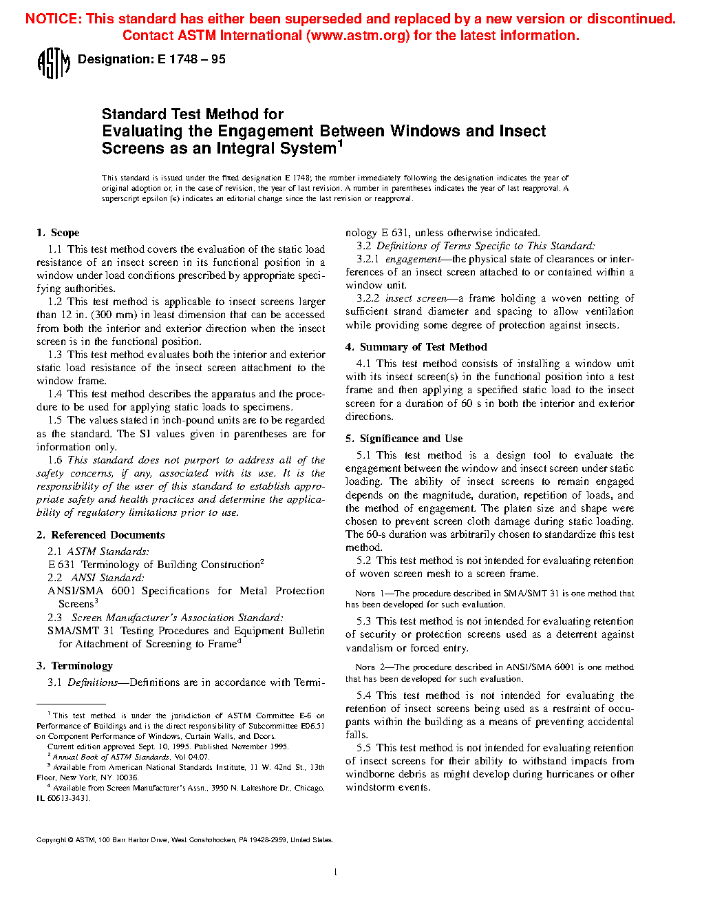 This test method is not intended for evaluating the retention of insect screens being used as a restraint of occupants within the building as a means of preventing accidental falls.