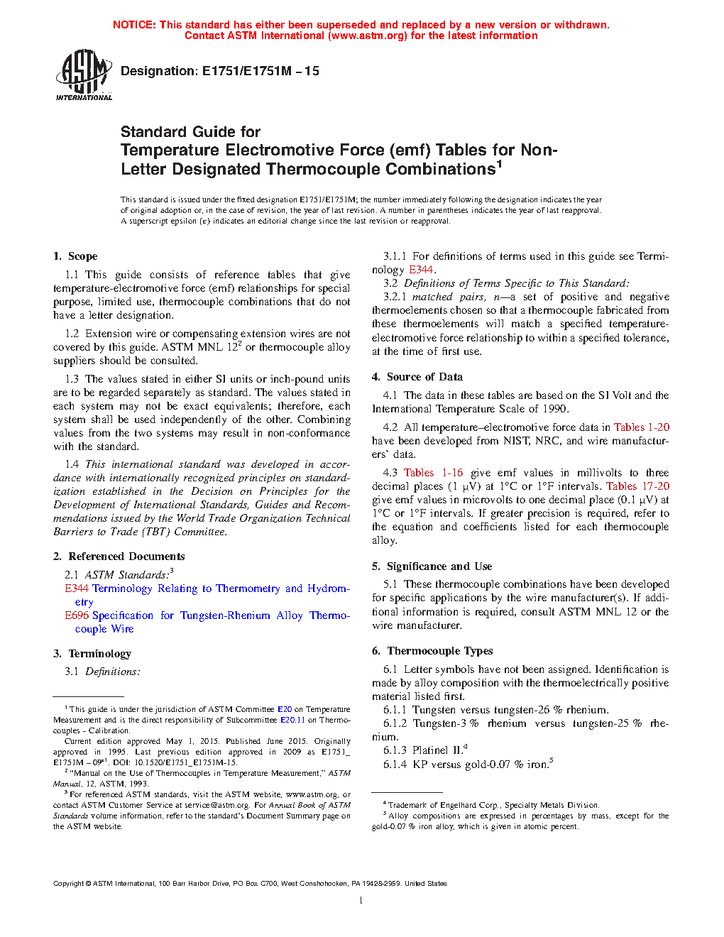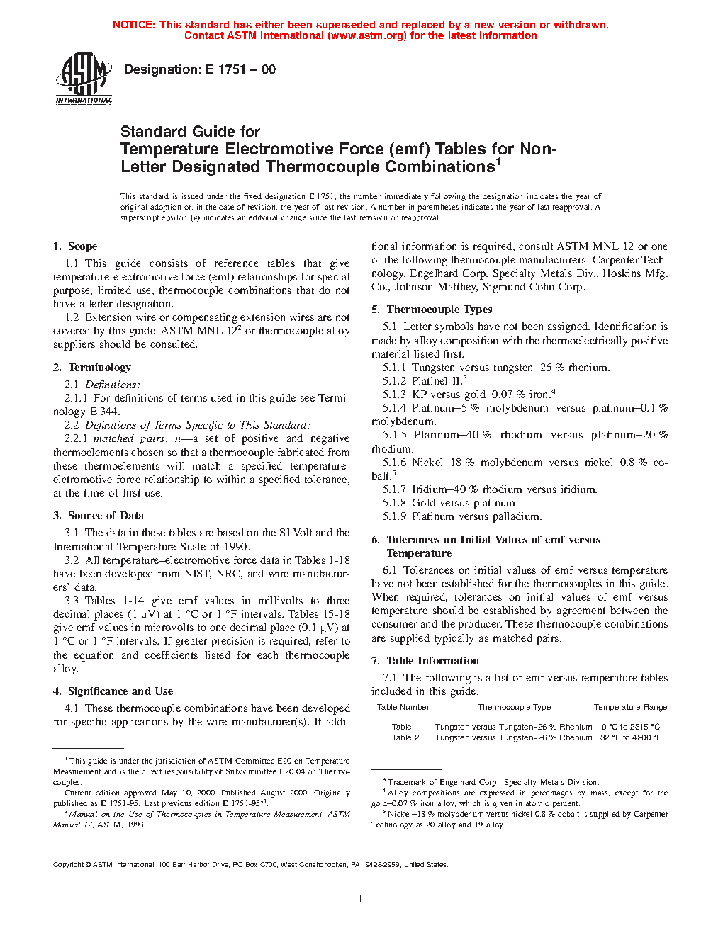 1.1 This guide consists of reference tables that give temperature-electromotive force (emf) relationships for special purpose, limited use, thermocouple combinations that do not have a letter designation.