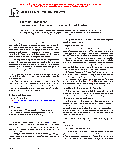 1.1 This practice covers a reproducible way to convert hardwoods, softwoods, herbaceous materials (such as switchgrass and sericea), agricultural residues (such as corn stover, wheat straw, and bagasse), wastepaper (such as office waste, boxboard, and newsprint), feedstocks pretreated to improve suitability for fermentation and fermentation residues into a uniform material suitable for compositional analysis.
