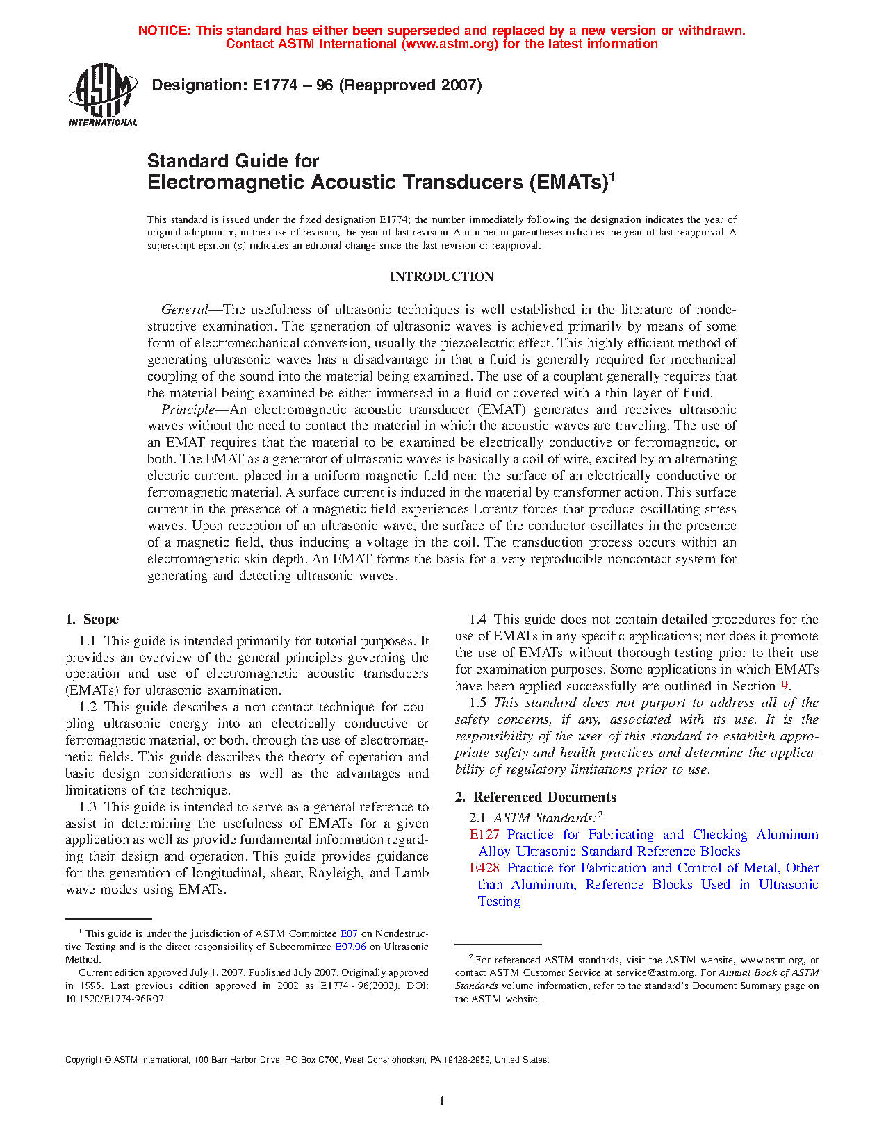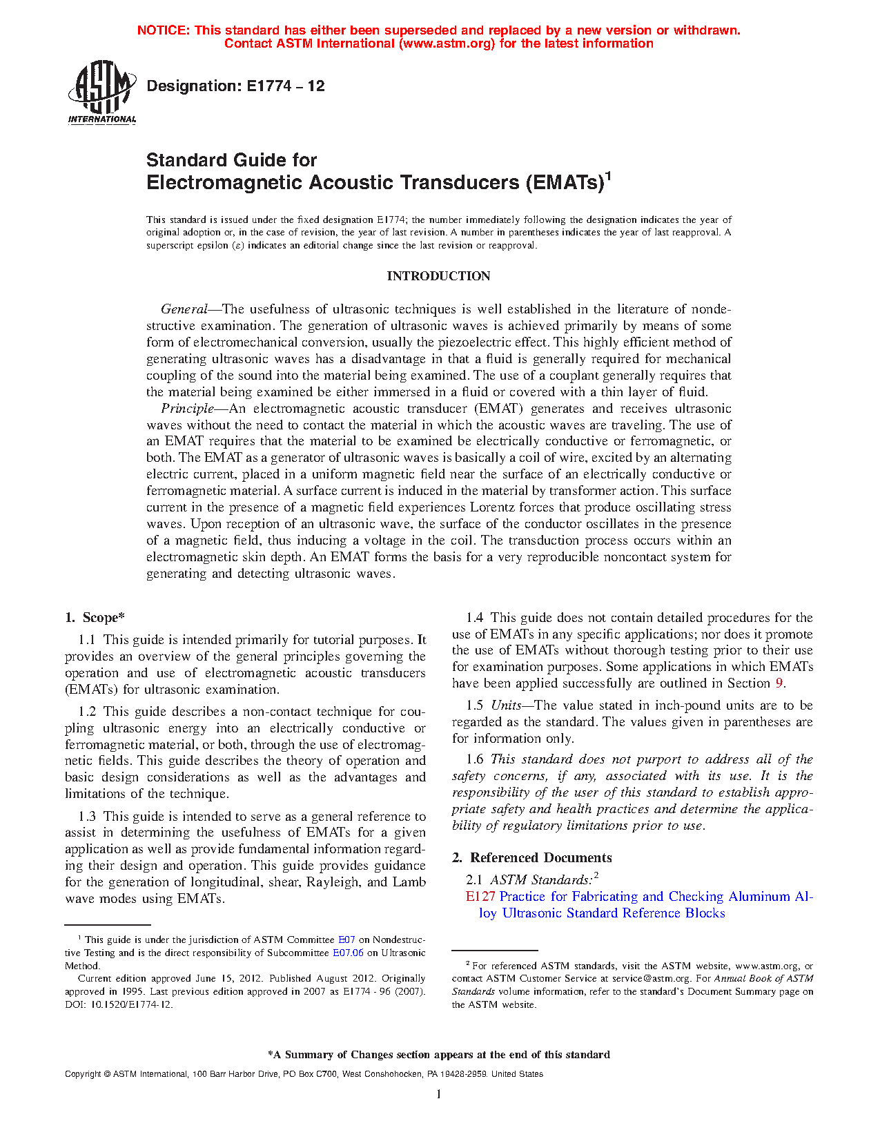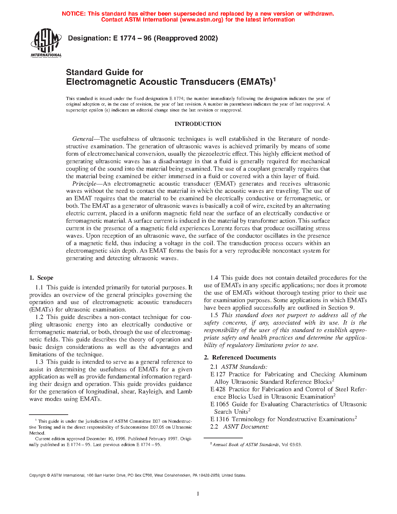 1.2 This guide describes a non-contact technique for coupling ultrasonic energy into an electrically conductive or ferromagnetic material, or both, through the use of electromagnetic fields. This guide describes the theory of operation and basic design considerations as well as the advantages and limitations of the technique.