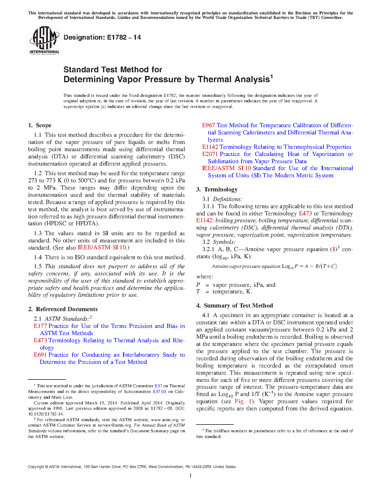 5.1 Vapor pressure is a fundamental thermophysical property of a liquid. Vapor pressure data are useful in process design and control, in establishing environmental regulations for safe handling and transport, for estimation of volatile organic content (VOC), and in deriving hazard assessments. Vapor pressure and boiling temperature data are required for Material Safety Data Sheets (MSDS). The enthalpy of vaporization may also be estimated from the slope of the vapor pressure curve (see Practice E2071).