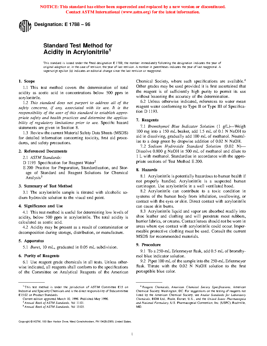 This test method is useful for determining low levels of acidity, below 500 μg/g in acrylonitrile. The total acidity is calculated as acetic acid.