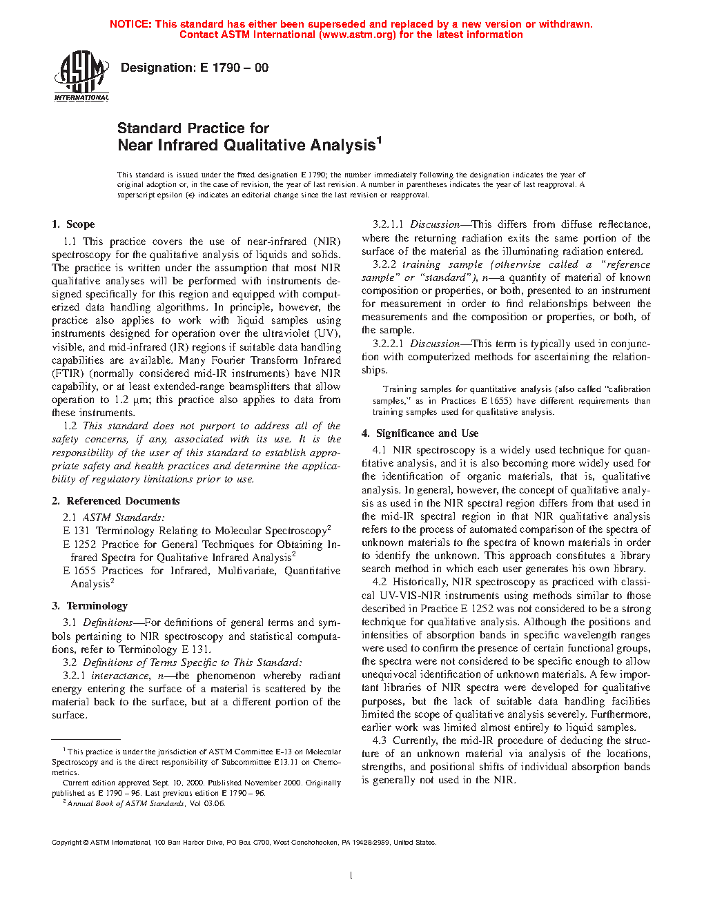 1.1 This practice covers the use of near-infrared (NIR) spectroscopy for the qualitative analysis of liquids and solids. The practice is written under the assumption that most NIR qualitative analyses will be performed with instruments designed specifically for this region and equipped with computerized data handling algorithms. In principle, however, the practice also applies to work with liquid samples using instruments designed for operation over the ultraviolet (UV), visible, and mid-infrared (IR) regions if suitable data handling capabilities are available. Many Fourier Transform Infrared (FTIR) (normally considered mid-IR instruments) have NIR capability, or at least extended-range beamsplitters that allow operation to 1.2 μm; this practice also applies to data from these instruments.