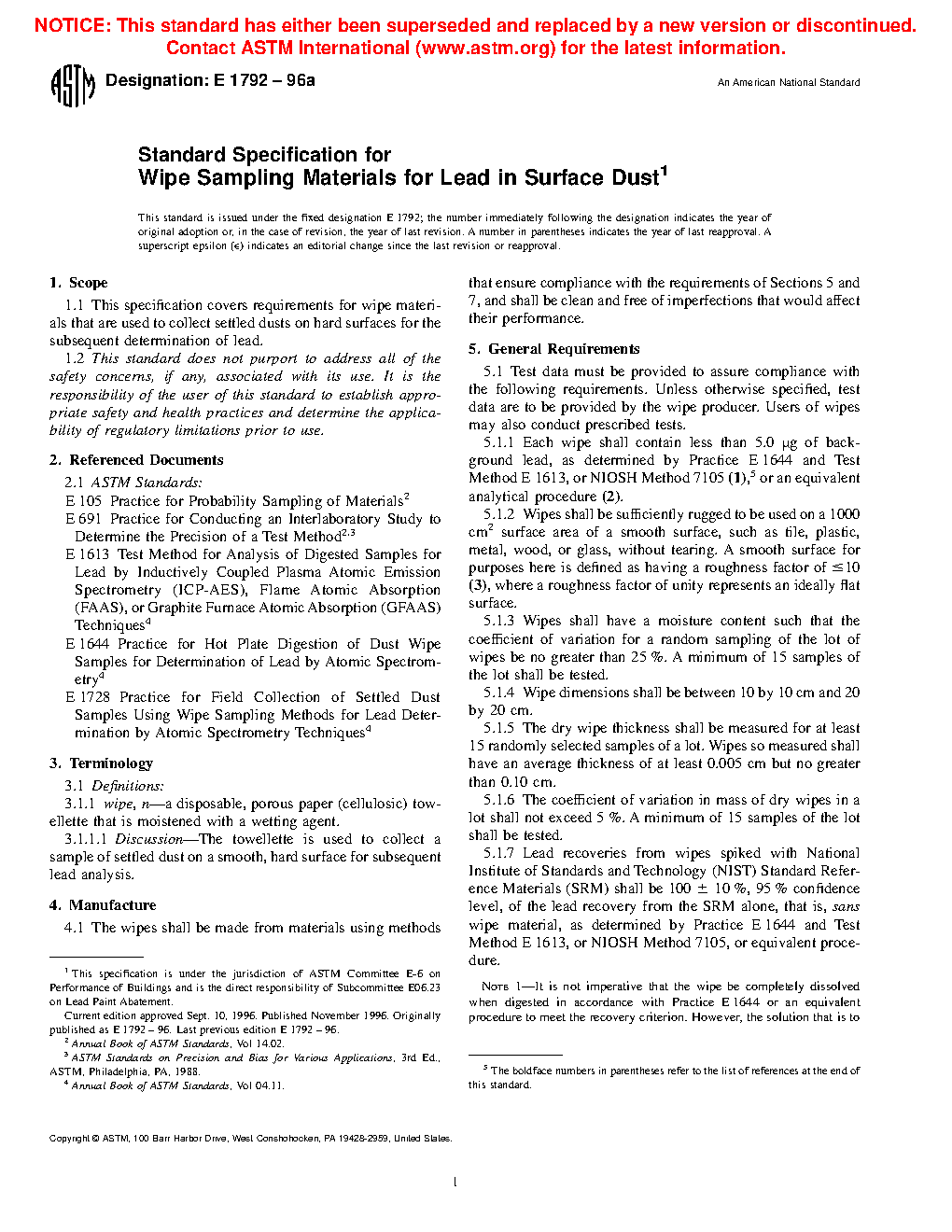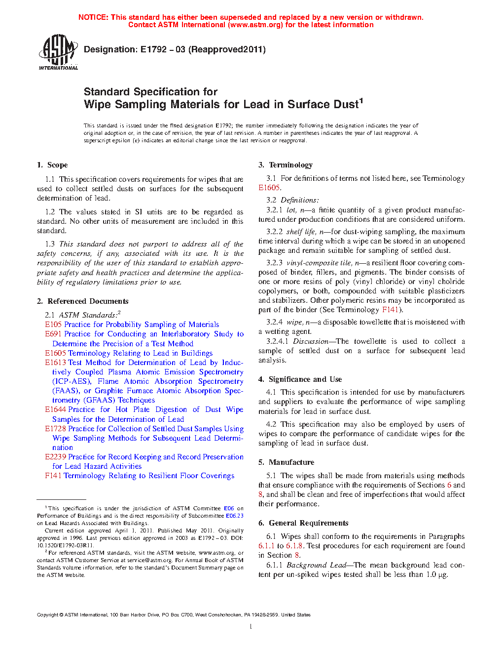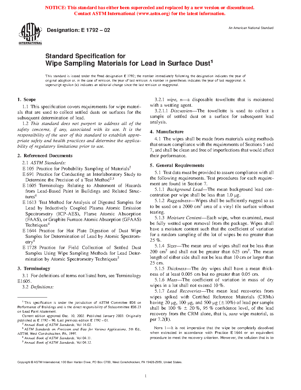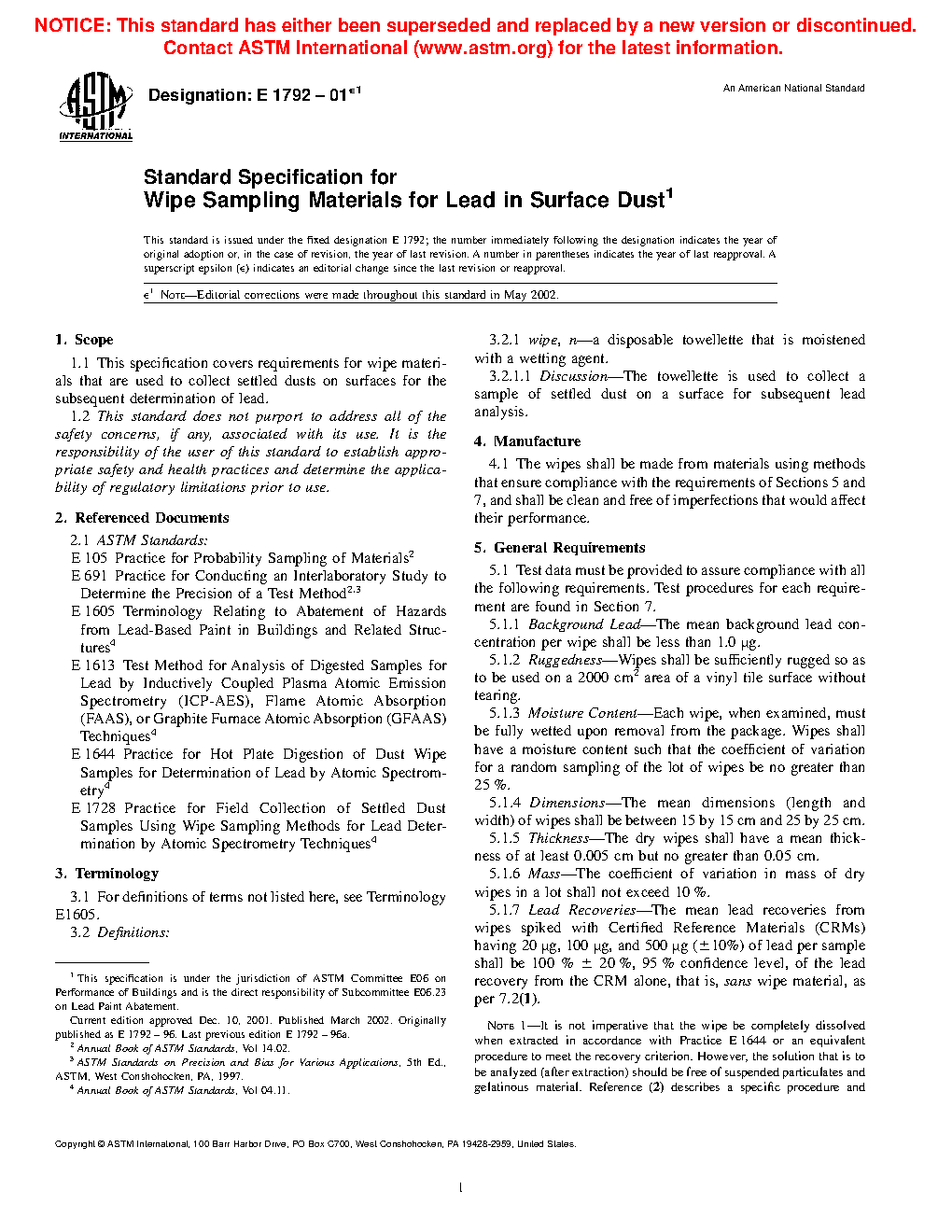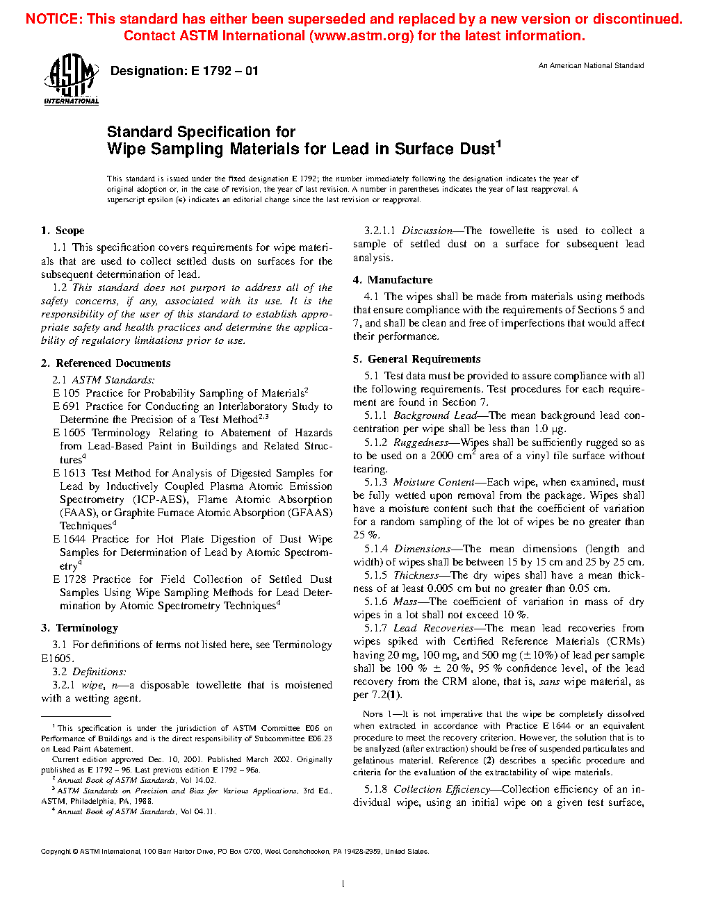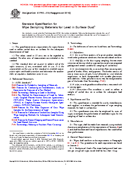This specification covers requirements for wipe sampling materials that are used to collect settled dusts on surfaces for the subsequent determination of lead. The wipes shall be tested for conformance to background lead, lead recoverability, collection efficiency, ruggedness which shall be determined using butted vinyl-composite floor tiles as a test surface, moisture content, coefficient of variation in mass, linear dimensions such as mean area and mean length, and mean thickness requirements.