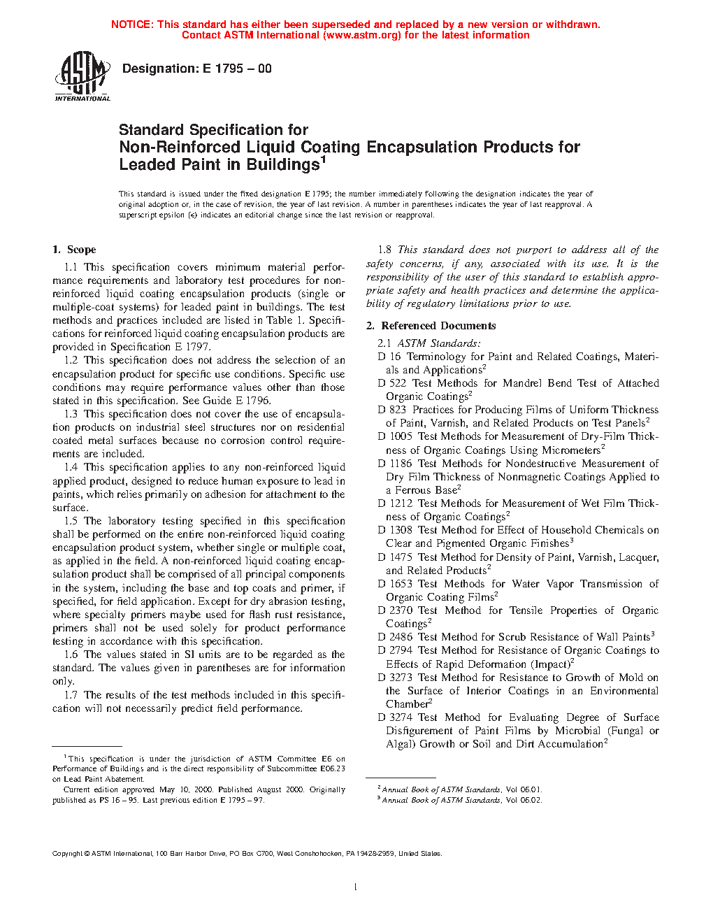 1.1 This specification covers minimum material performance requirements and laboratory test procedures for non-reinforced liquid coating encapsulation products (single or multiple-coat systems) for leaded paint in buildings. Performance properties addressed in this specification are: