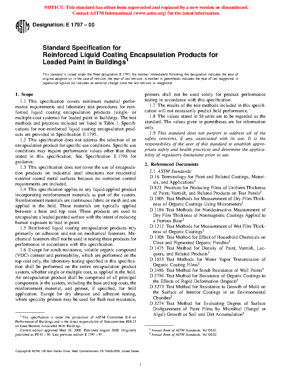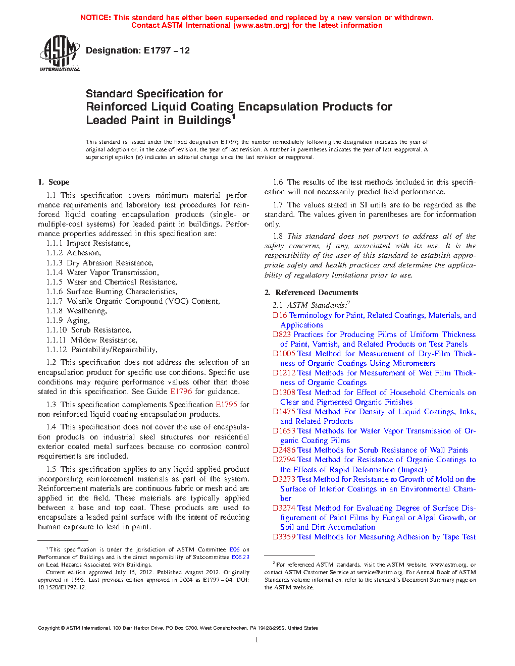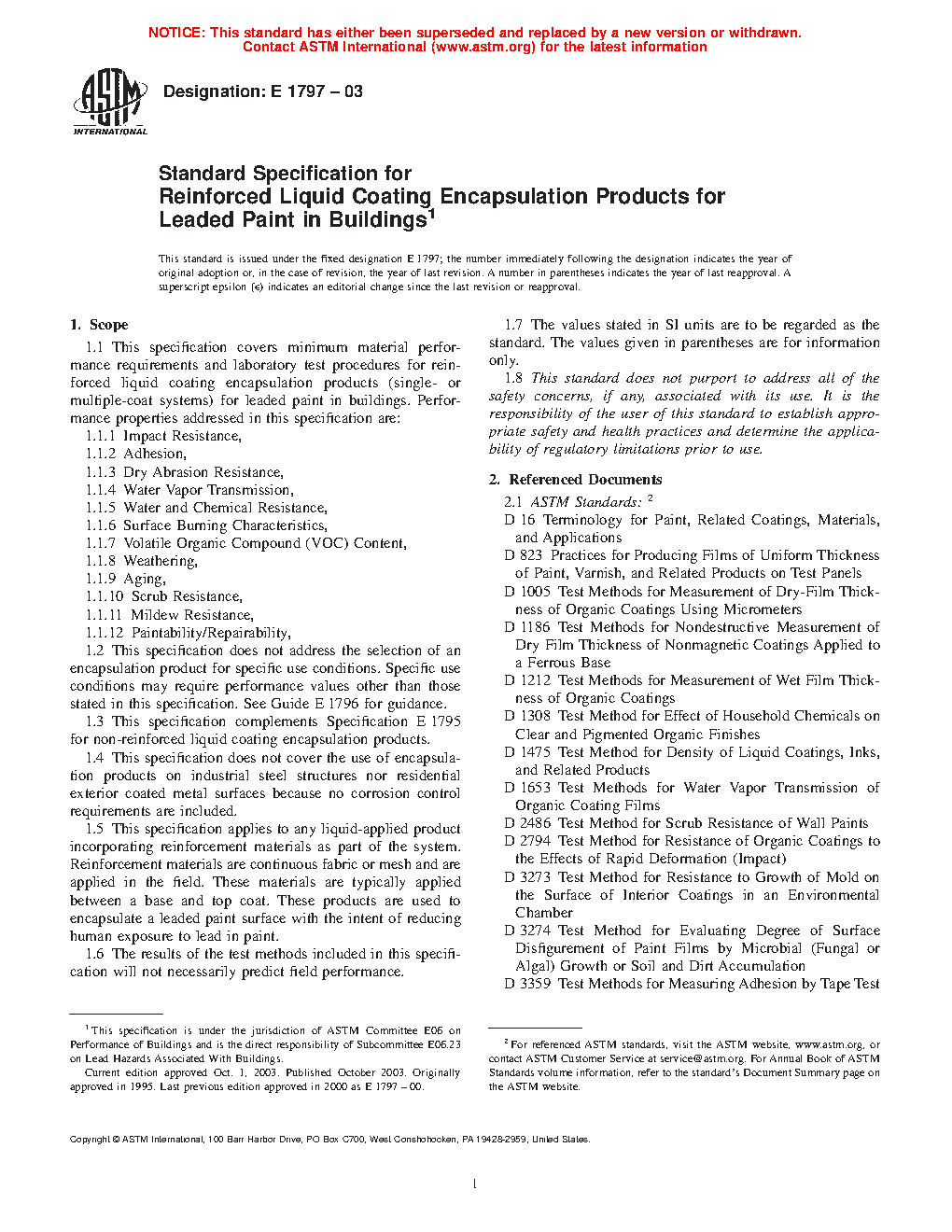 This specification covers minimum material performance requirements and laboratory test procedures for reinforced liquid coating encapsulation products (single- or multiple-coat systems) for leaded paint in buildings. It applies to any liquid-applied product incorporating reinforcement materials as part of the system. Reinforcement materials are continuous fabric or mesh and are applied in the field. These materials are typically applied between a base and top coat. These products are used to encapsulate a leaded paint surface with the intent of reducing human exposure to lead in paint. These are classified into three types which are Type I which are encapsulation products are intended for interior use, Type II which are encapsulation products intended for exterior use, and Type III which defines encapsulation products intended for either interior or exterior use. Different tests shall be conducted in order to determine the following performance properties for reinforced liquid coating encapsulation products such as impact resistance, adhesion, dry abrasion resistance, water vapor transmission, water resistance, chemical resistance, surface burning characteristics, volatile organic compound content, weathering, aging, scrub resistance, mildew resistance, paint ability and repairability. Testing conducted shall be performed on the entire encapsulation product system, whether single or multiple coat, as applied in the field, except for scrub resistance, volatile organic compound (VOC) content, and permeability, which are performed on the top coat only.