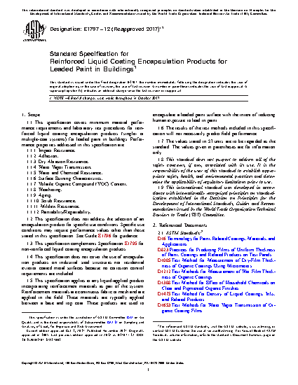 1.1 This specification covers minimum material performance requirements and laboratory test procedures for reinforced liquid coating encapsulation products (single- or multiple-coat systems) for leaded paint in buildings. Performance properties addressed in this specification are: