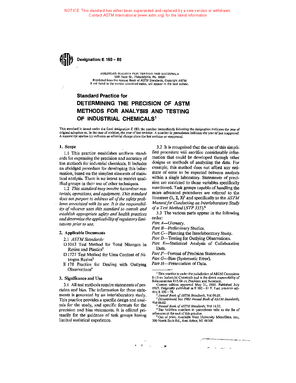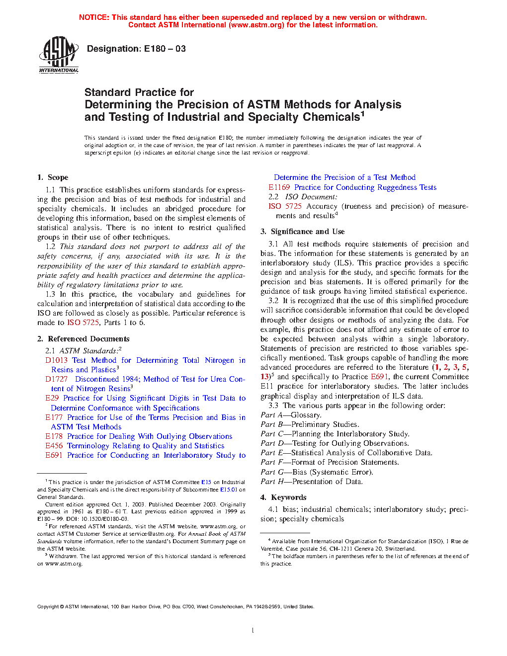 1.1 This practice establishes uniform standards for expressing the precision and bias of test methods for industrial and specialty chemicals. It includes an abridged procedure for developing this information, based on the simplest elements of statistical analysis. There is no intent to restrict qualified groups in their use of other techniques.