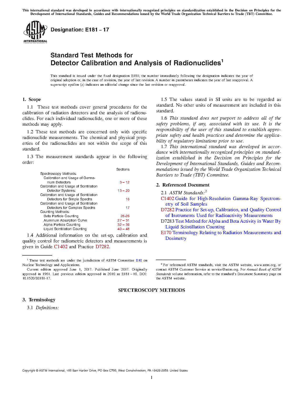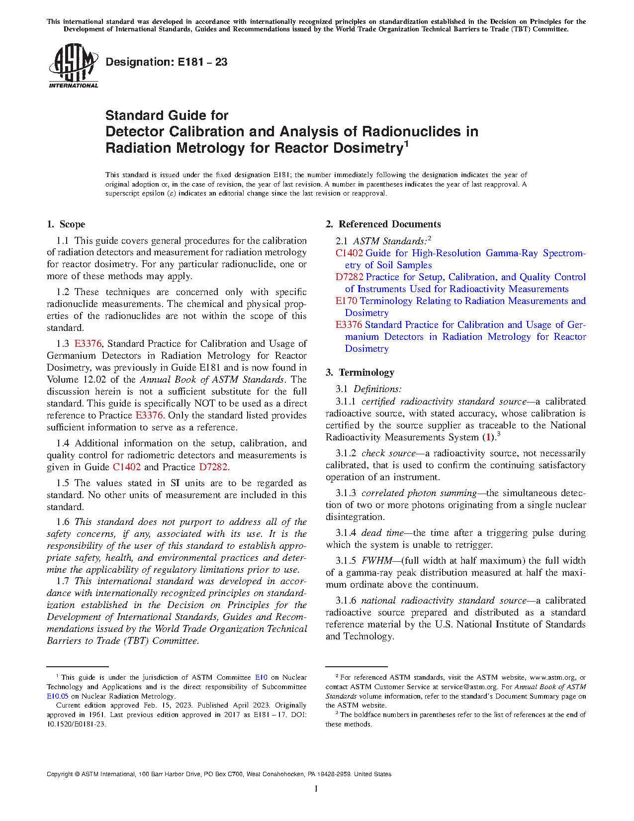 1.3 E3376, Standard Practice for Calibration and Usage of Germanium Detectors in Radiation Metrology for Reactor Dosimetry, was previously in Guide E181 and is now found in Volume 12.02 of the Annual Book of ASTM Standards. The discussion herein is not a sufficient substitute for the full standard. This guide is specifically NOT to be used as a direct reference to Practice E3376. Only the standard listed provides sufficient information to serve as a reference.