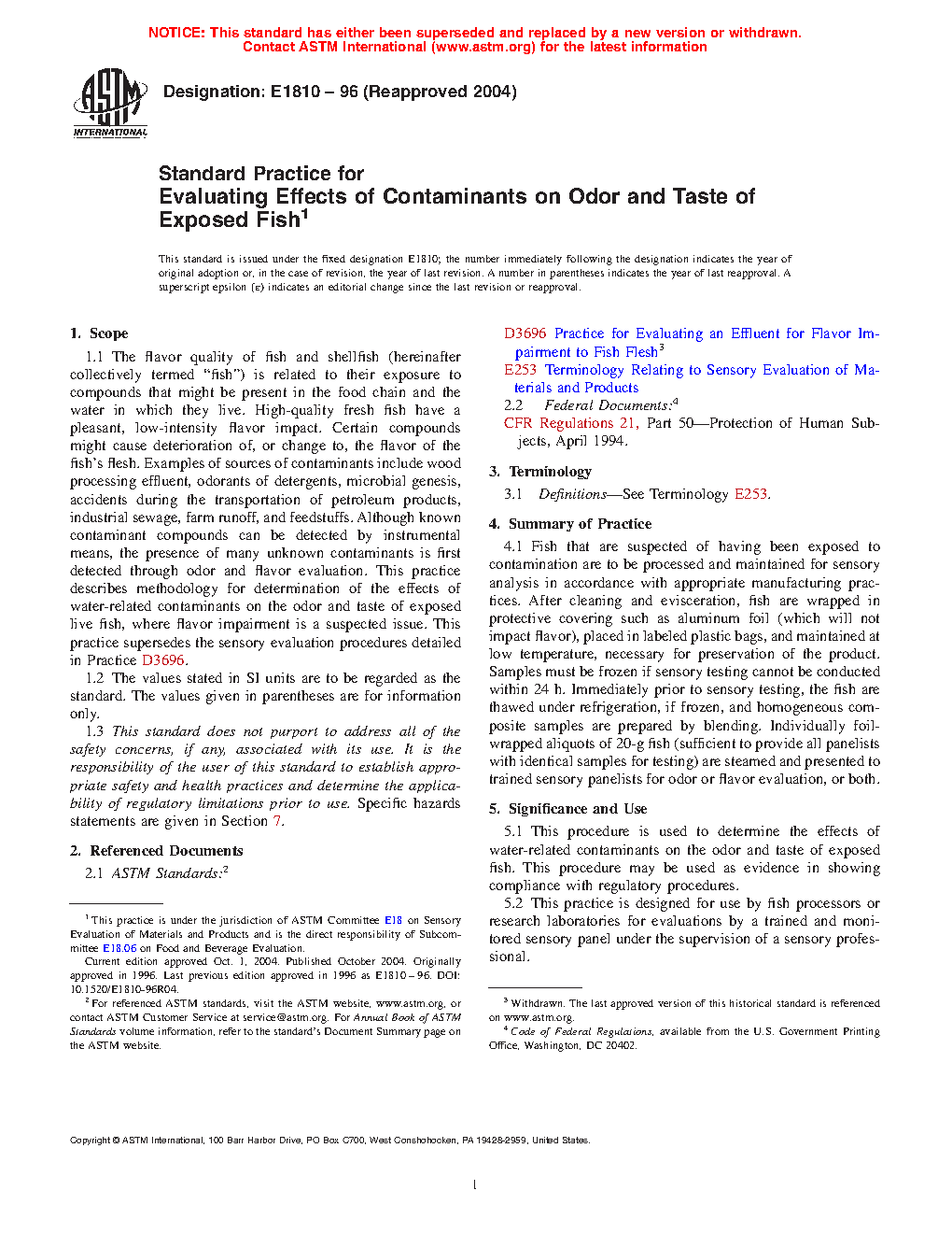 5.1 This procedure is used to determine the effects of water-related contaminants on the odor and taste of exposed fish. This procedure may be used as evidence in showing compliance with regulatory procedures.