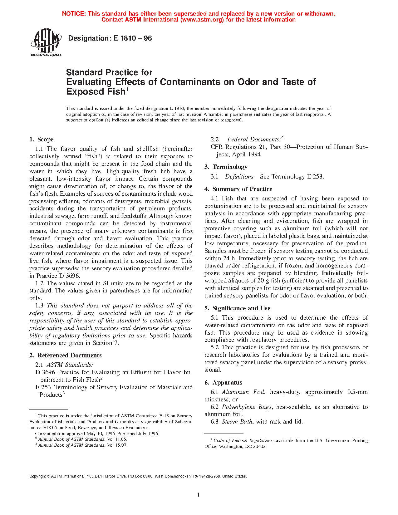 1.1 The flavor quality of fish and shellfish (hereinafter collectively termed "fish") is related to their exposure to compounds that might be present in the food chain and the water in which they live. High-quality fresh fish have a pleasant, low-intensity flavor impact. Certain compounds might cause deterioration of, or change to, the flavor of the fish's flesh. Examples of sources of contaminants include wood processing effluent, odorants of detergents, microbial genesis, accidents during the transportation of petroleum products, industrial sewage, farm runoff, and feedstuffs. Although known contaminant compounds can be detected by instrumental means, the presence of many unknown contaminants is first detected through odor and flavor evaluation. This practice describes methodology for determination of the effects of water-related contaminants on the odor and taste of exposed live fish, where flavor impairment is a suspected issue. This practice supersedes the sensory evaluation procedures detailed in Practice D 3696.