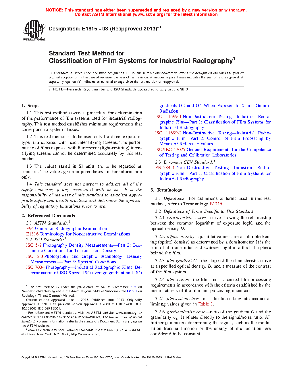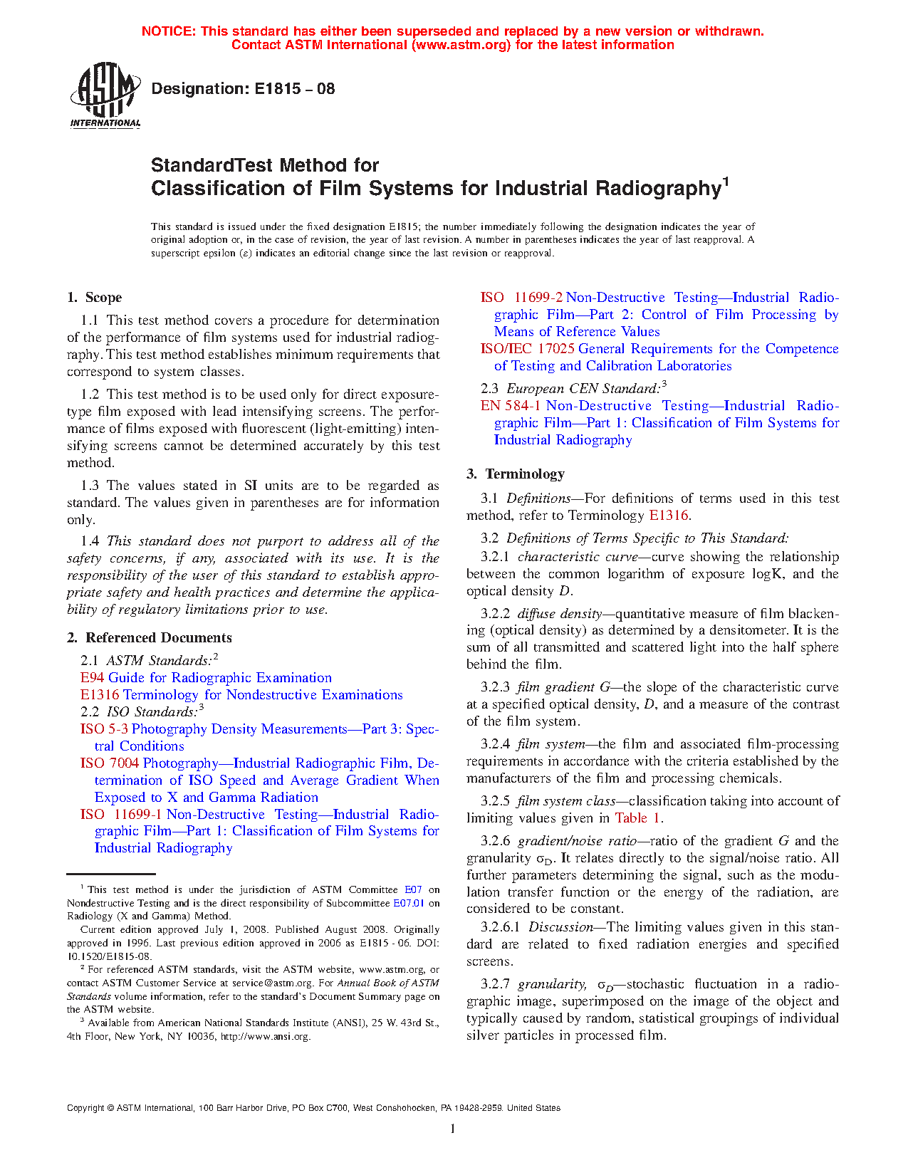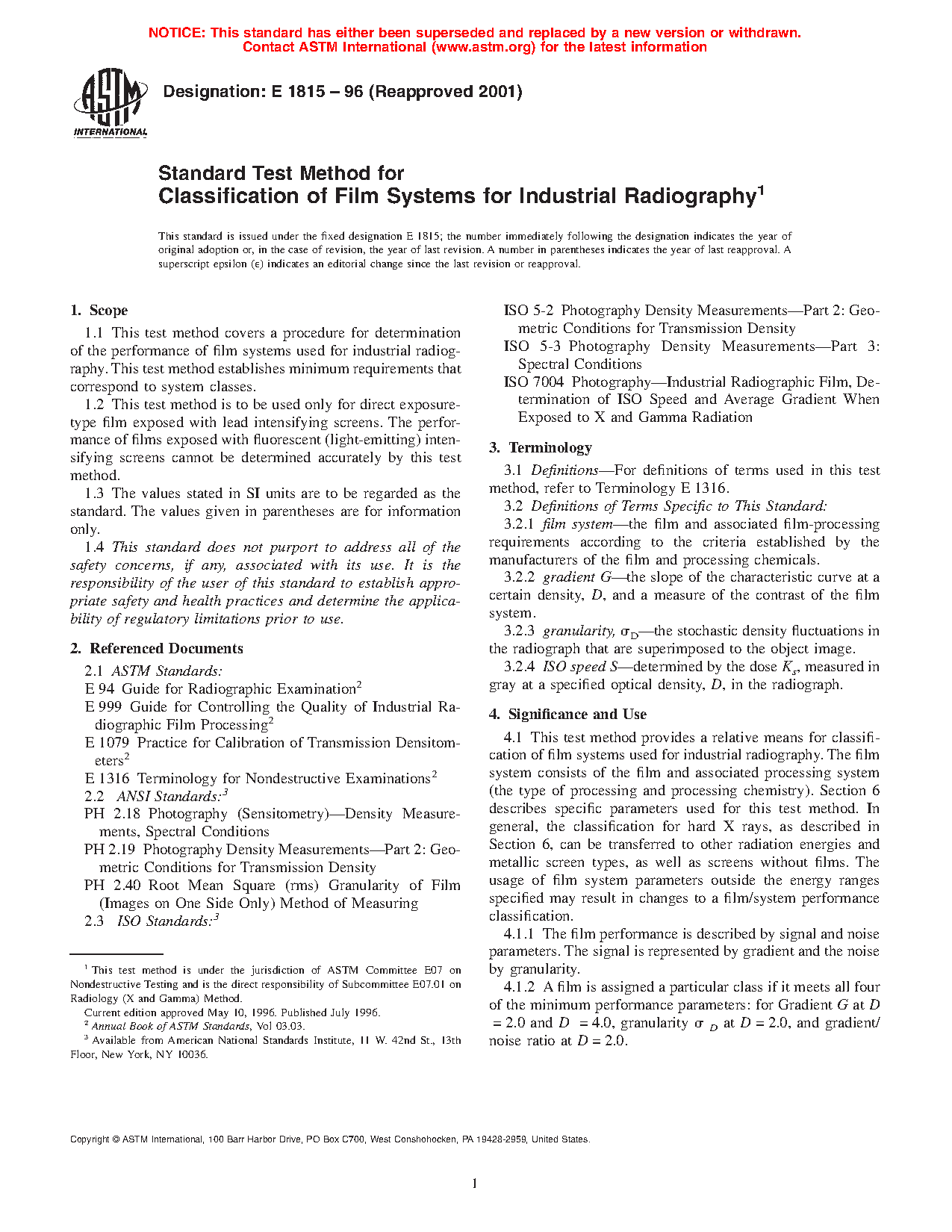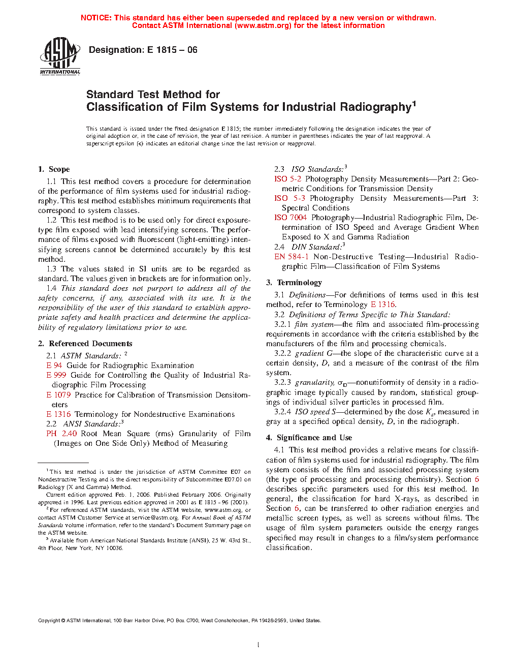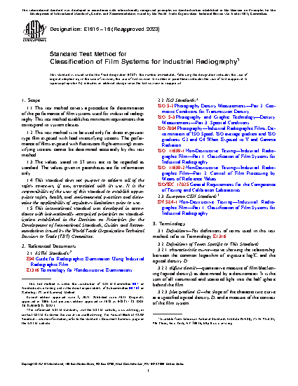 1.1 This test method covers a procedure for determination of the performance of film systems used for industrial radiography. This test method establishes minimum requirements that correspond to system classes.
