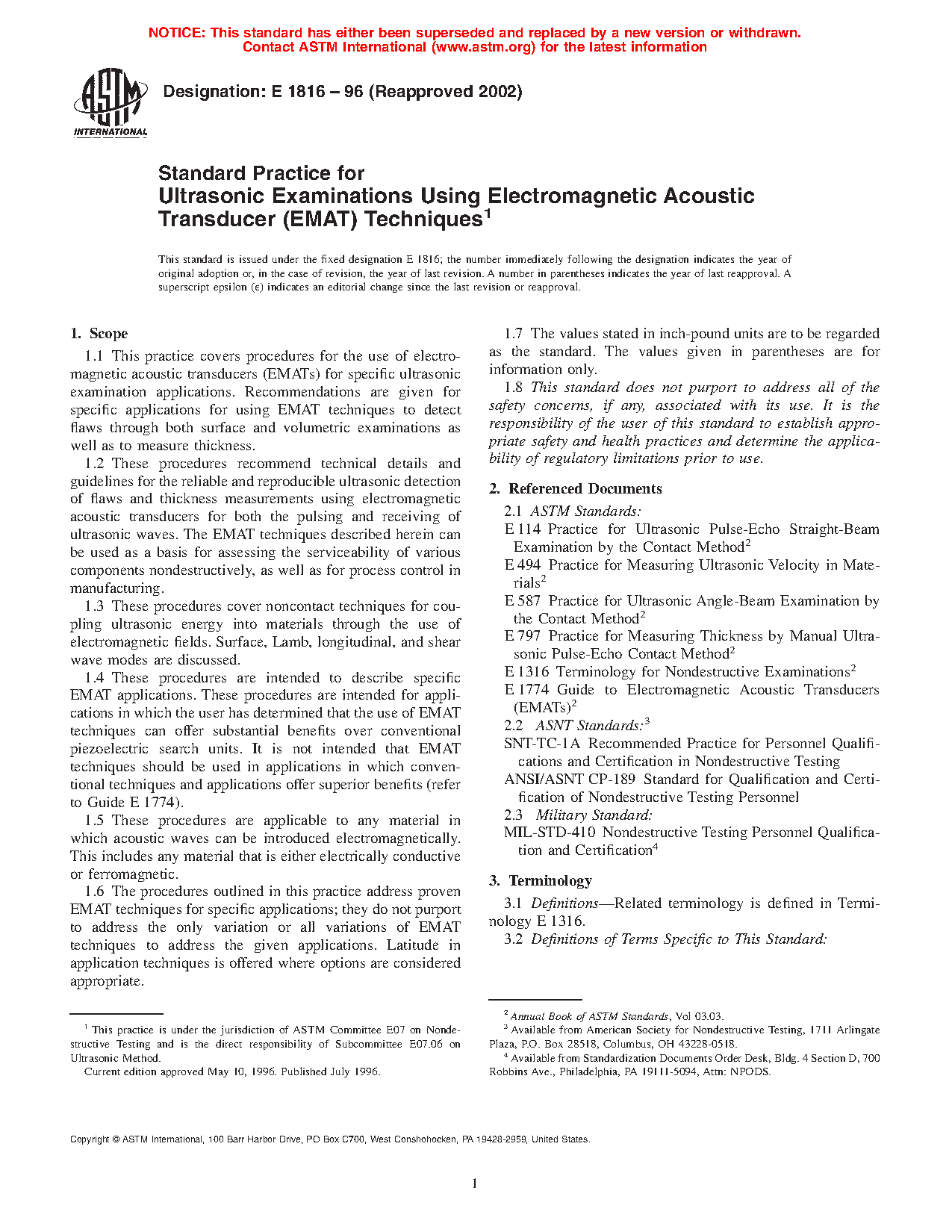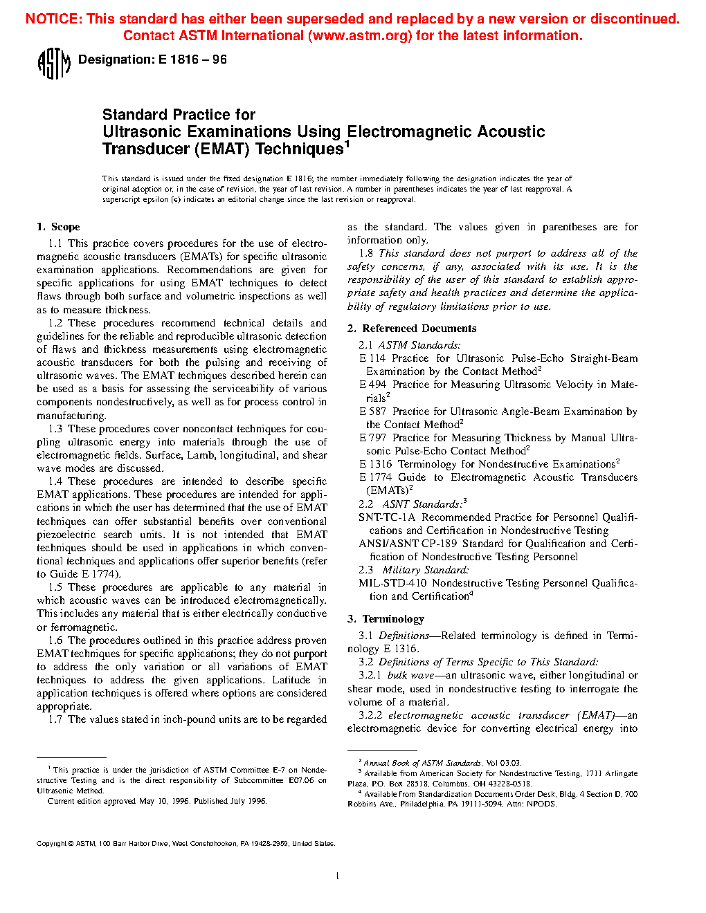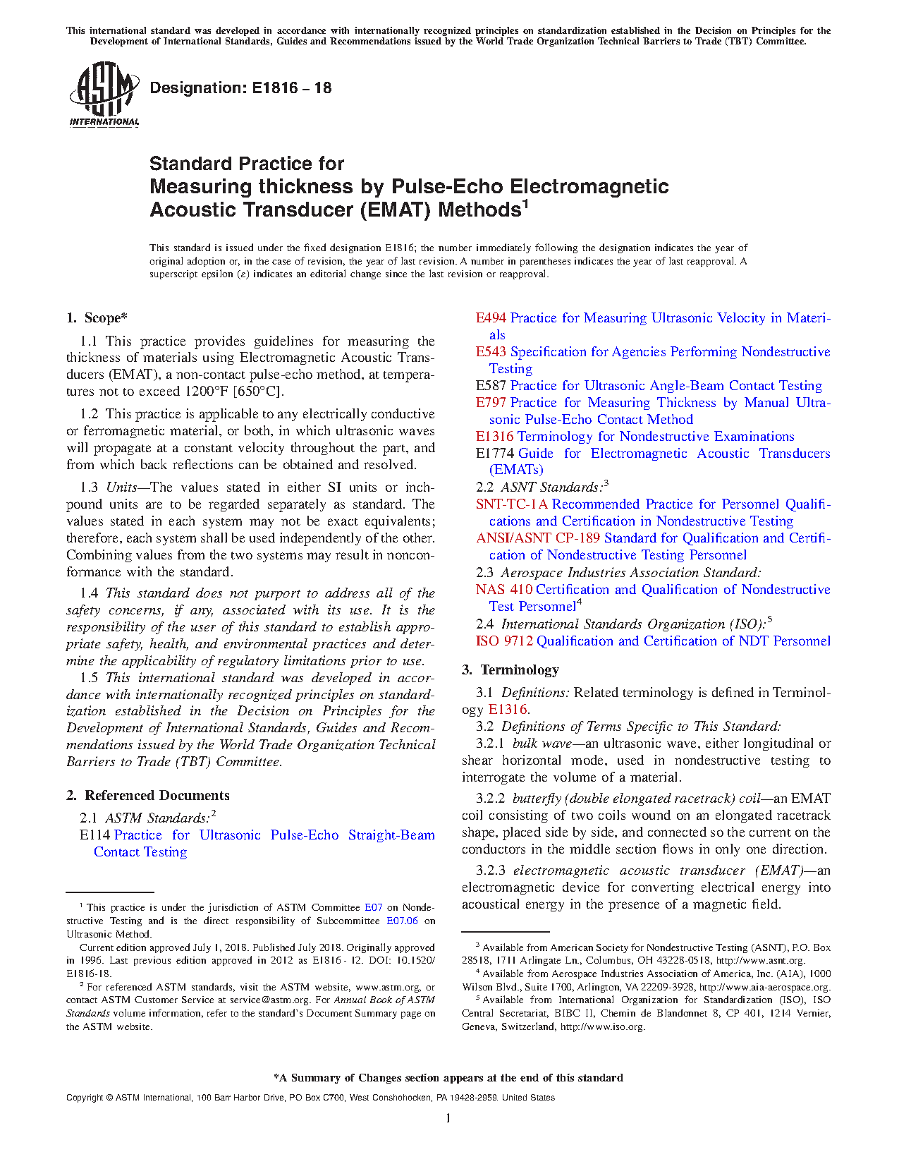 1.1 This practice provides guidelines for measuring the thickness of materials using Electromagnetic Acoustic Transducers (EMAT), a non-contact pulse-echo method, at temperatures not to exceed 1200°F [650°C].
