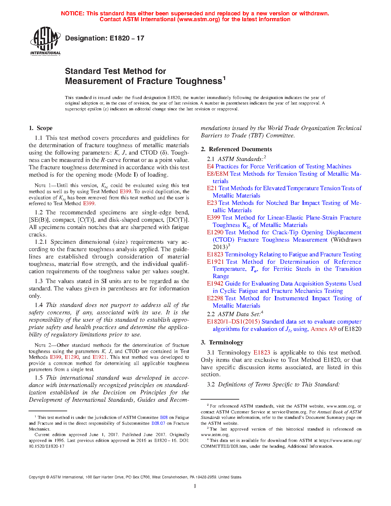 1.1 This test method covers procedures and guidelines for the determination of fracture toughness of metallic materials using the following parameters: K, J, and CTOD (d). Toughness can be measured in the R-curve format or as a point value. The fracture toughness determined in accordance with this test method is for the opening mode (Mode I) of loading.