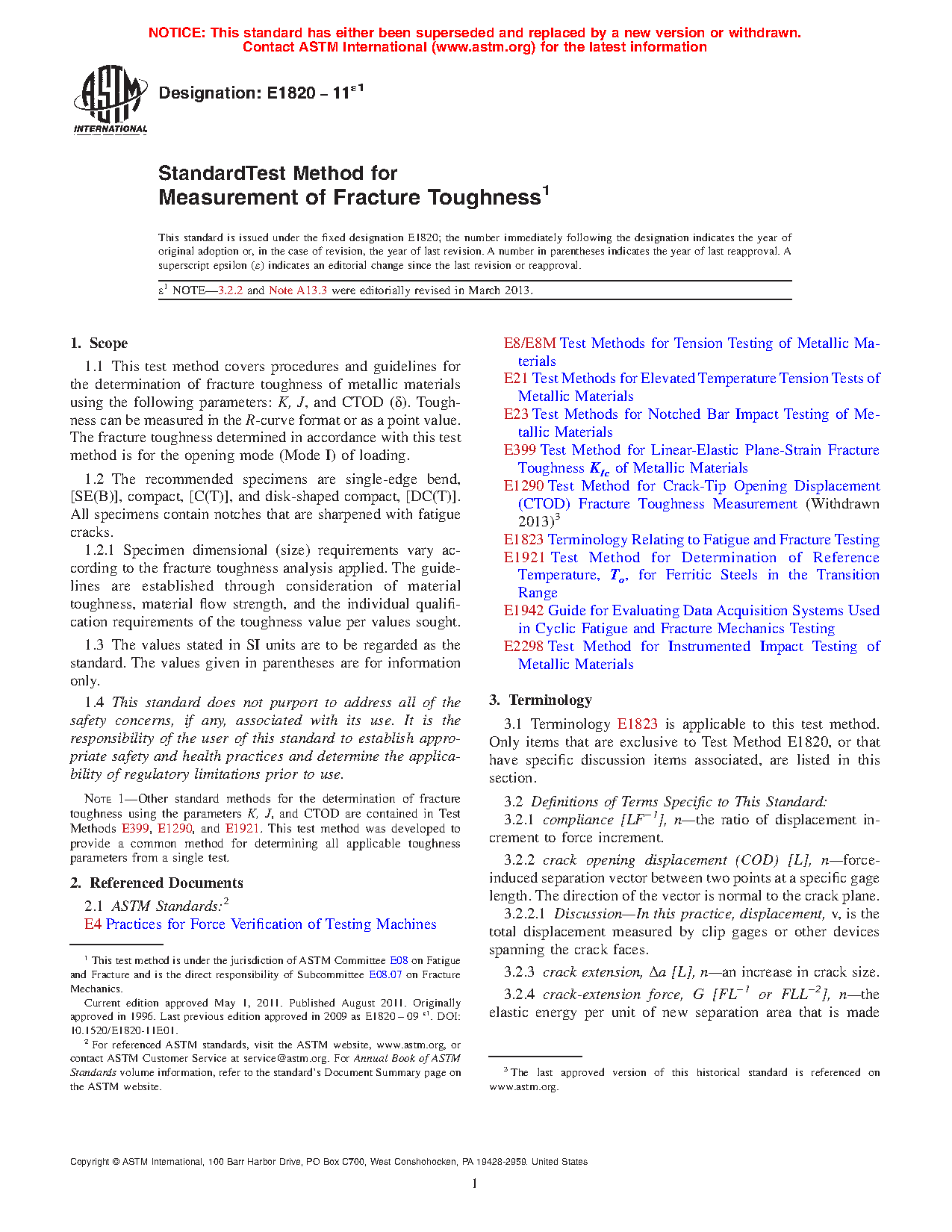1.1 This test method covers procedures and guidelines for the determination of fracture toughness of metallic materials using the following parameters: K, J, and CTOD (d). Toughness can be measured in the R-curve format or as a point value. The fracture toughness determined in accordance with this test method is for the opening mode (Mode I) of loading.