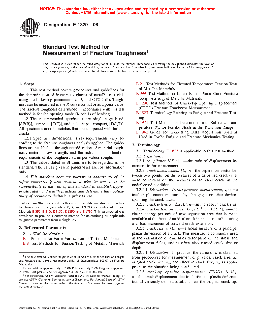 Note 2: Other standard methods for the determination of fracture toughness using the parameters K, J, and CTOD are contained in Test Methods E399, E1290, and E1921. This test method was developed to provide a common method for determining all applicable toughness parameters from a single test.