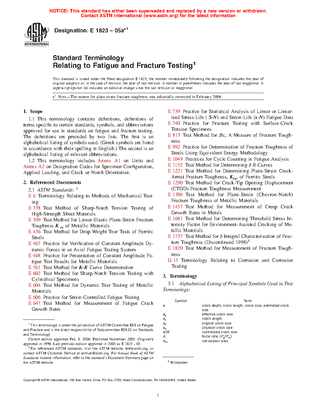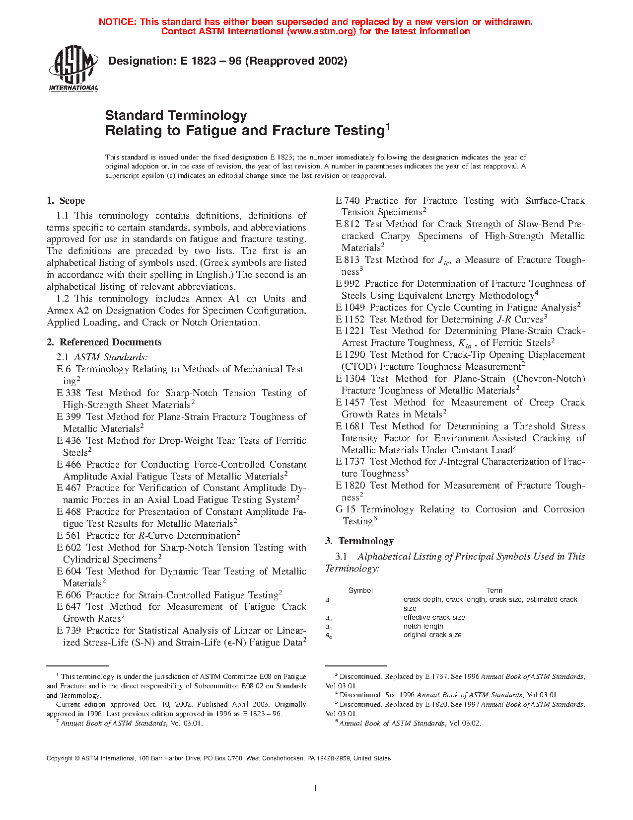 1.1 This terminology contains definitions, definitions of terms specific to certain standards, symbols, and abbreviations approved for use in standards on fatigue and fracture testing. The definitions are preceded by two lists. The first is an alphabetical listing of symbols used. (Greek symbols are listed in accordance with their spelling in English.) The second is an alphabetical listing of relevant abbreviations.