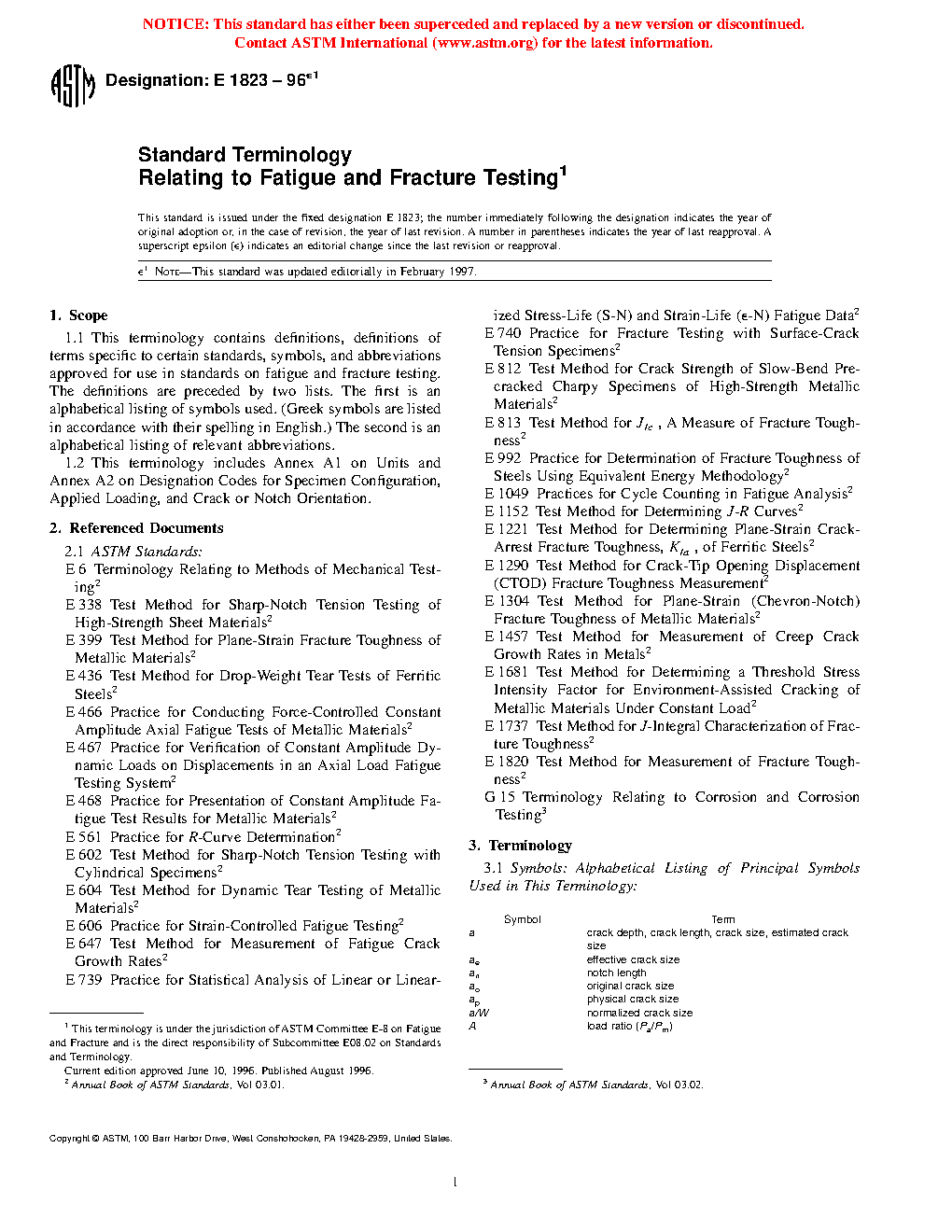 1.1 This terminology contains definitions, definitions of terms specific to certain standards, symbols, and abbreviations approved for use in standards on fatigue and fracture testing. The definitions are preceded by two lists. The first is an alphabetical listing of symbols used. (Greek symbols are listed in accordance with their spelling in English.) The second is an alphabetical listing of relevant abbreviations.