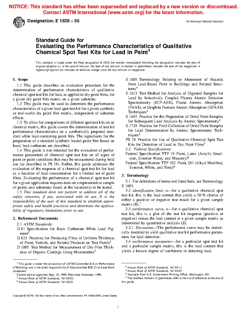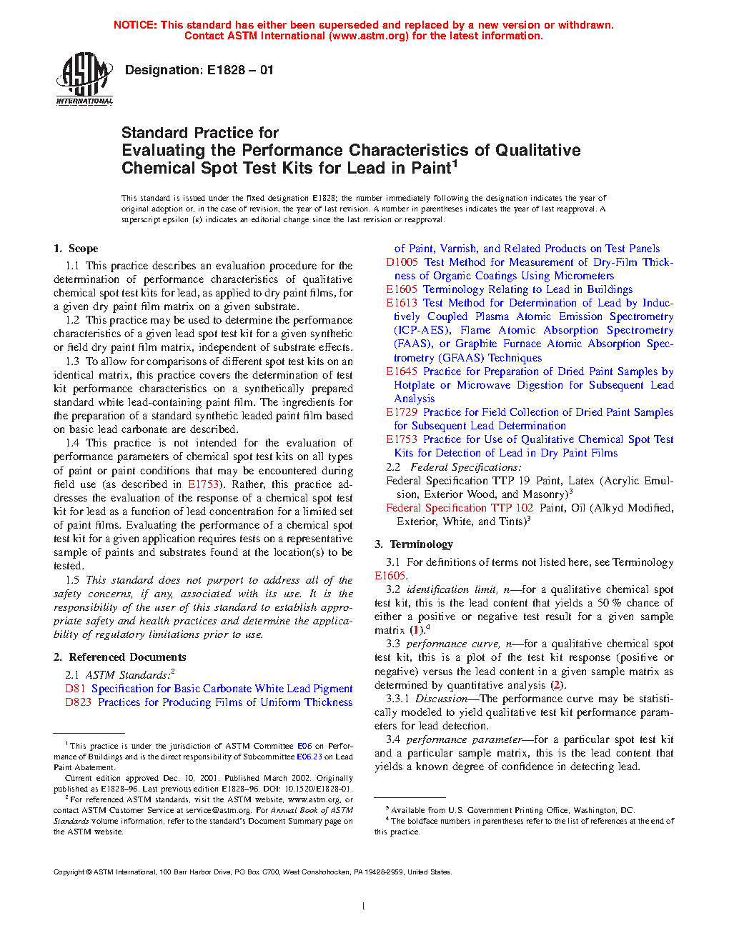 1.1 This practice describes an evaluation procedure for the determination of performance characteristics of qualitative chemical spot test kits for lead, as applied to dry paint films, for a given dry paint film matrix on a given substrate.